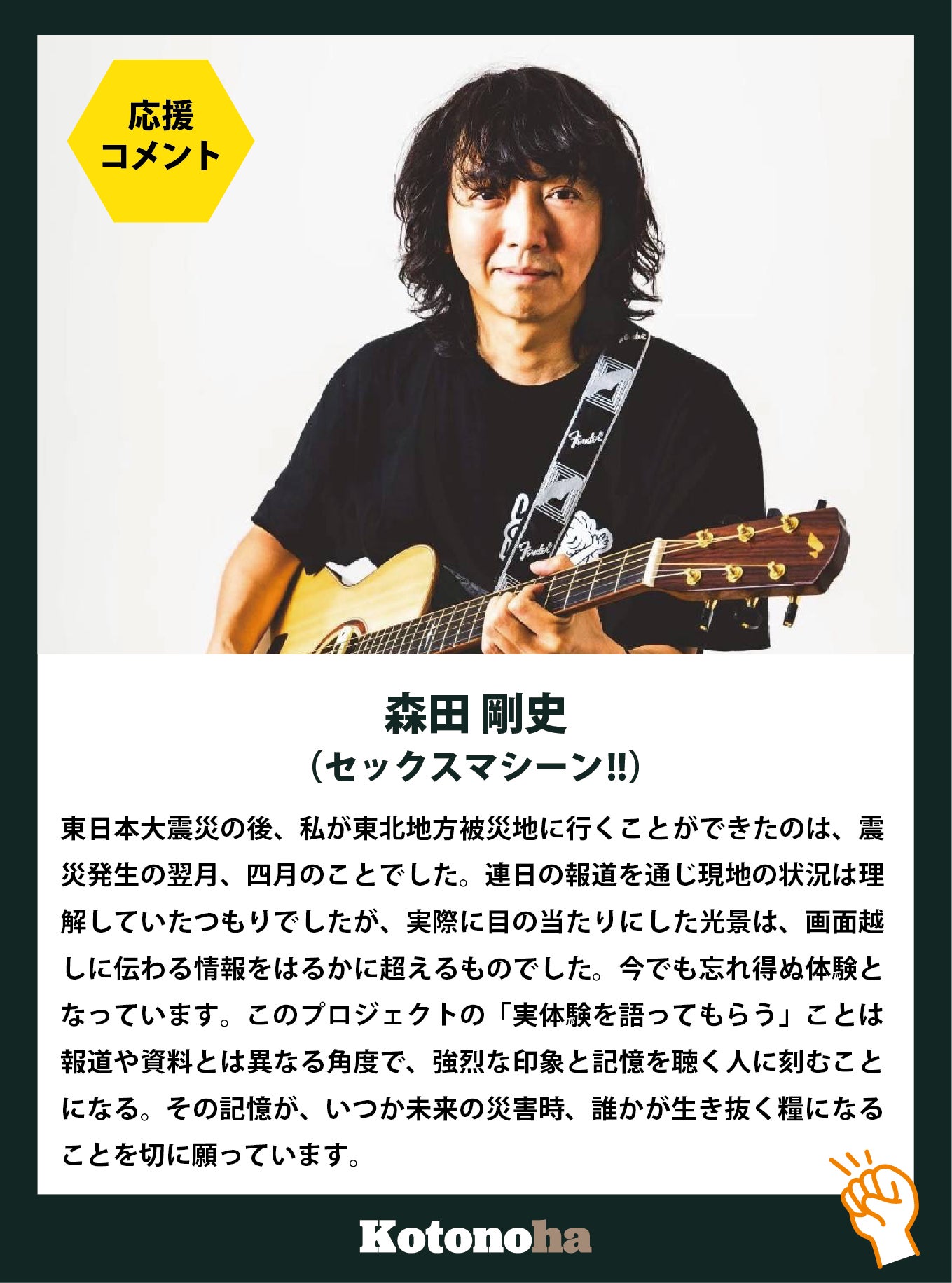 2026/04/15 16:14新たなリターンプラン「Kotonoha x SBE LIMITED」の受付を開始しました。今回のプランは、岩手・盛岡発のエモーショナルロックバンドSBEの皆さんと共に制作した楽曲「Kotonoha」を軸にした、クラウドファンディング限定の特別な内容となっています。・限定アコースティック音源CD・KotonohaxSBE オリジナルコラボステッカー・直筆サイン入り Lyricカード(Bプランのみ)いずれも、このクラウドファンディングでしか手に入らない限定アイテムです。数量にも限りがあり、なくなり次第終了となります。この楽曲には「言葉に動かされ、言葉に支えられてきた」という実体験と、語り部の言葉を未来へ届けていきたいという想いが込められています。語り部の言葉を、音楽というかたちに変え、より多くの人へ、より遠くへ届けていく。その新しい挑戦が、この「Kotonoha x SBE LIMITED」です。そしてこのクラウドファンディングも、いよいよ【4月末まで】となりました。ここからの一歩が、このプロジェクトの未来を大きく左右します。少しでも共感いただけた方は、ぜひご支援という形で参加していただけると嬉しいです。そして、SNSでのシェアや拡散も大きな力になります。一人でも多くの方に、この言葉と音楽が届くように。最後まで、どうか応援をよろしくお願いいたします。 もっと見る