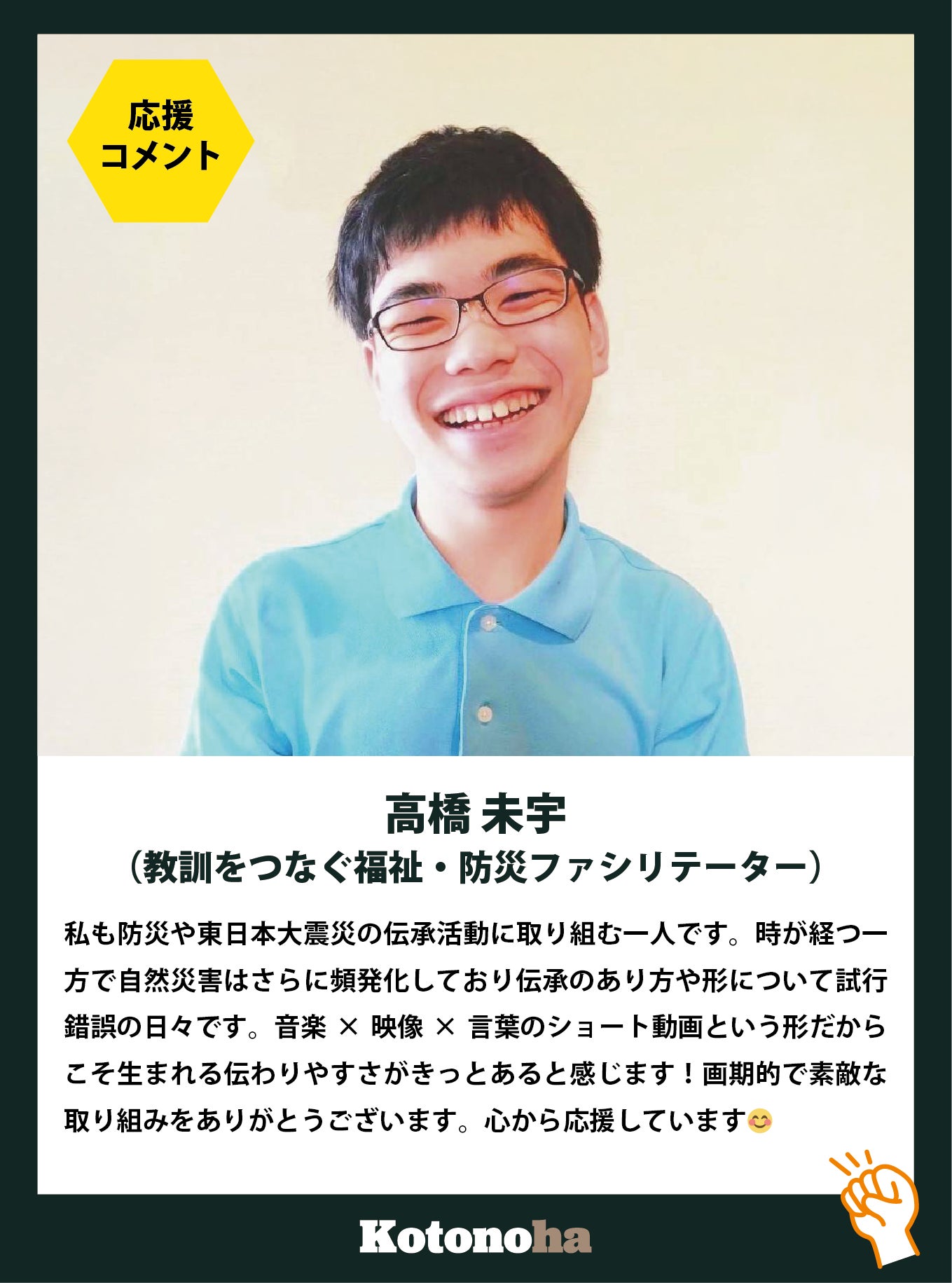 語り部の言葉は、過去の出来事を伝えるだけのものではありません。それは、未来の誰かの行動につながり、命を守る力になる言葉です。この言葉を、次の世代へ。そのための挑戦として、言の葉プロジェクトを進めていきたいと思っています。