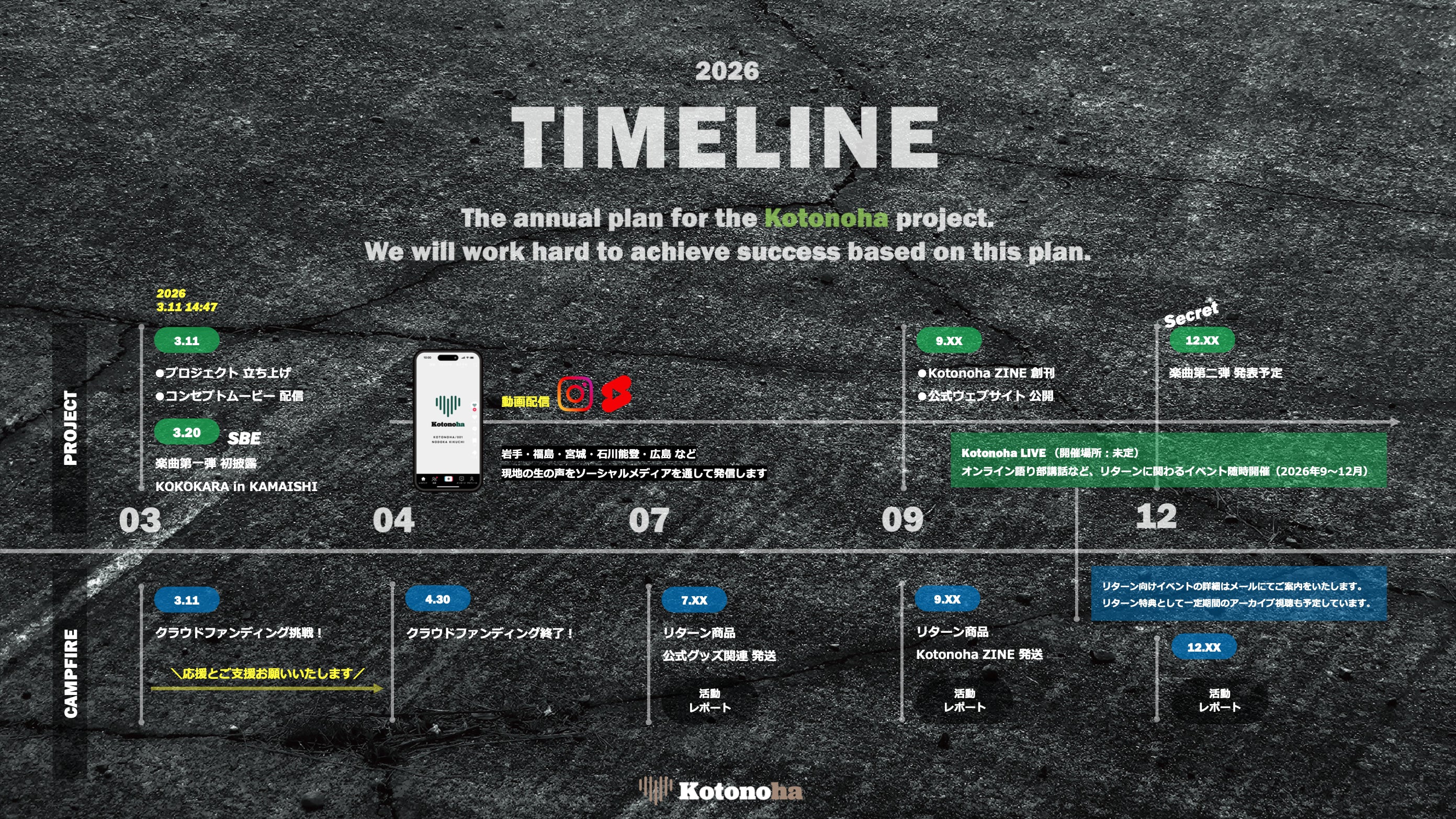 オンラインとリアルを往復しながら、東北から始まる一曲を全国へ広げていきます。それは単なる楽曲リリースではなく、語りを社会の中で生き続けさせるための仕組みづくりです。