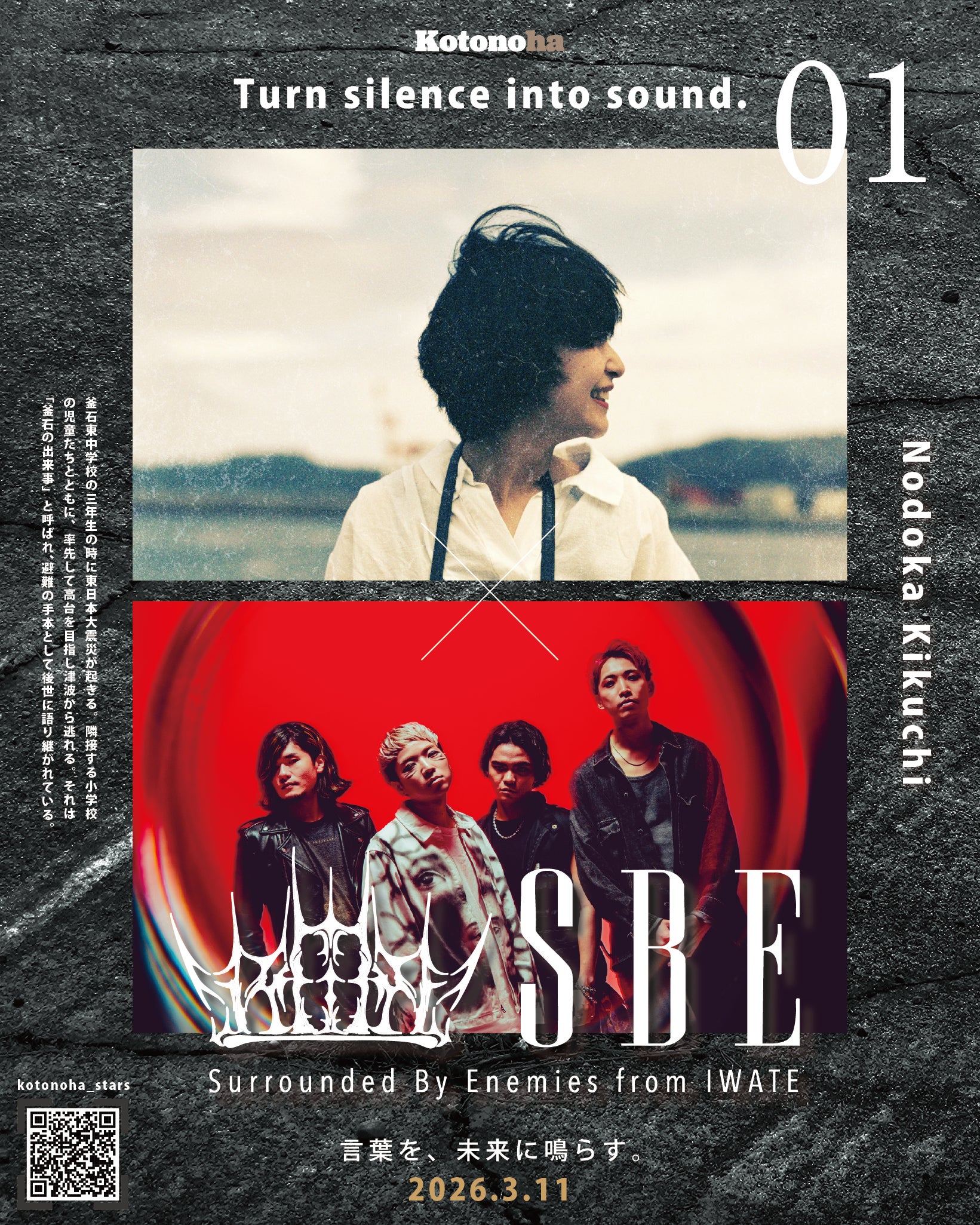 2026/04/11 19:34言の葉プロジェクト第一弾楽曲「Kotonoha」のショートムービーを公開しました。この楽曲は、岩手・盛岡発のエモーショナルロックバンド、SBEによって制作された作品です。東日本大震災の語り部の言葉をもとに、その一つひとつに向き合いながら、音へと昇華させていきました。時間の経過とともに、触れる機会が少なくなっていく“生の言葉”。その言葉を、いまの時代に届く形として残し、つないでいくために、この楽曲は生まれています。今回公開したのはショートムービーです。限られた時間の中ではありますが、この楽曲に込められた空気や温度、そして言葉の一端に触れていただけたら嬉しいです。短いからこそ広がる余白も含めて、感じていただければと思います。語り部の言葉を、これから先へと届けていく。その一歩として生まれた「Kotonoha」。まずはこのショートムービーを、ぜひご覧ください。 もっと見る