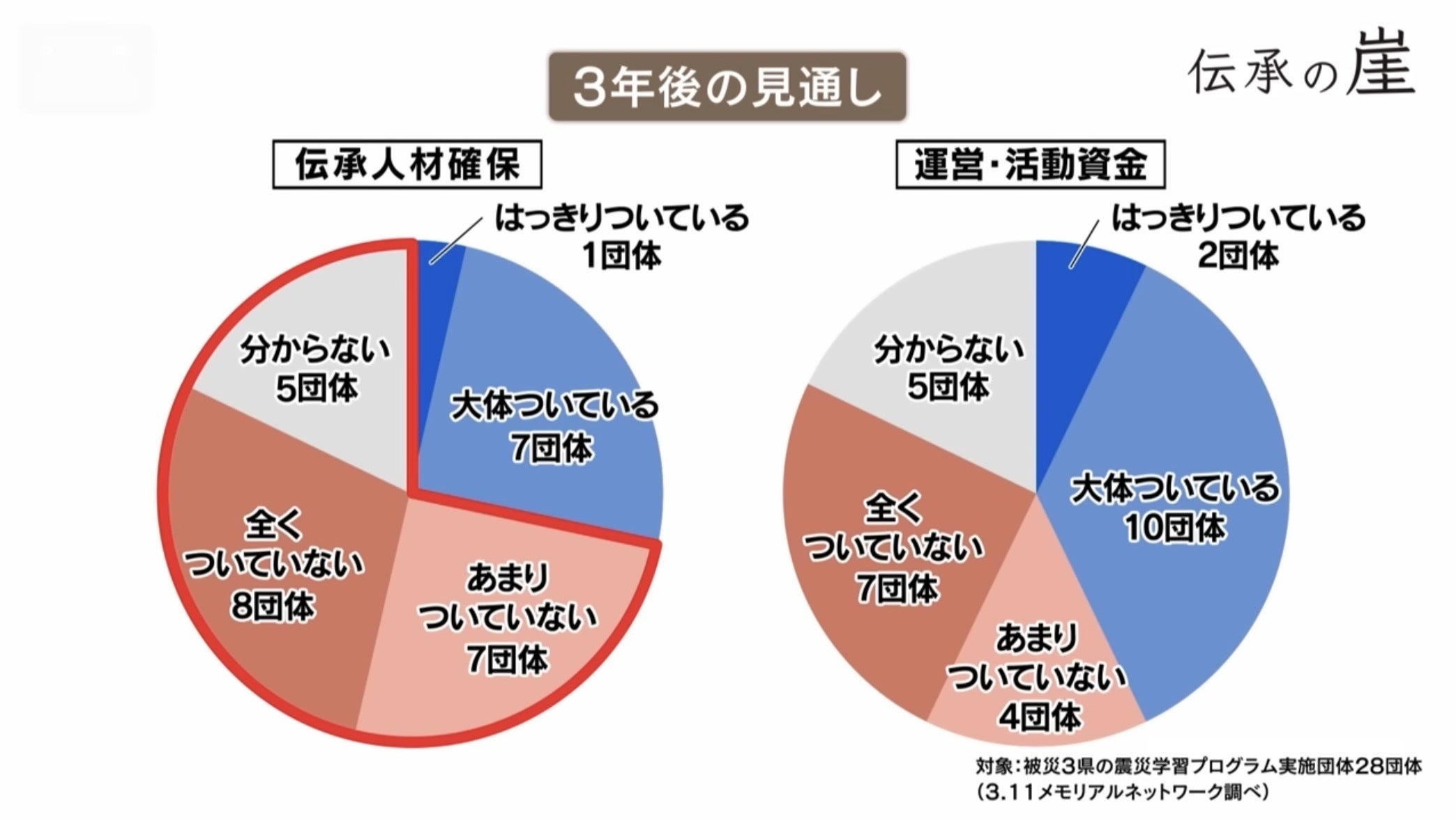 震災伝承団体への調査では、96%が「今後の活動継続に不安がある」と回答しています。また、3年後の伝承人材の確保について7割以上が「見通しが立たない」と回答しています。このままでは、語り部の活動そのものが続けられなくなる可能性があります。