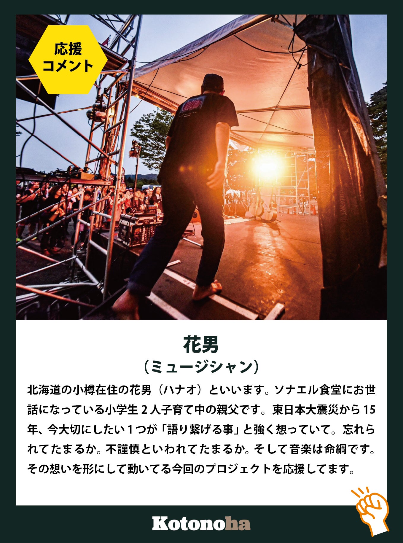 2026/04/15 16:14新たなリターンプラン「Kotonoha x SBE LIMITED」の受付を開始しました。今回のプランは、岩手・盛岡発のエモーショナルロックバンドSBEの皆さんと共に制作した楽曲「Kotonoha」を軸にした、クラウドファンディング限定の特別な内容となっています。・限定アコースティック音源CD・KotonohaxSBE オリジナルコラボステッカー・直筆サイン入り Lyricカード(Bプランのみ)いずれも、このクラウドファンディングでしか手に入らない限定アイテムです。数量にも限りがあり、なくなり次第終了となります。この楽曲には「言葉に動かされ、言葉に支えられてきた」という実体験と、語り部の言葉を未来へ届けていきたいという想いが込められています。語り部の言葉を、音楽というかたちに変え、より多くの人へ、より遠くへ届けていく。その新しい挑戦が、この「Kotonoha x SBE LIMITED」です。そしてこのクラウドファンディングも、いよいよ【4月末まで】となりました。ここからの一歩が、このプロジェクトの未来を大きく左右します。少しでも共感いただけた方は、ぜひご支援という形で参加していただけると嬉しいです。そして、SNSでのシェアや拡散も大きな力になります。一人でも多くの方に、この言葉と音楽が届くように。最後まで、どうか応援をよろしくお願いいたします。 もっと見る
