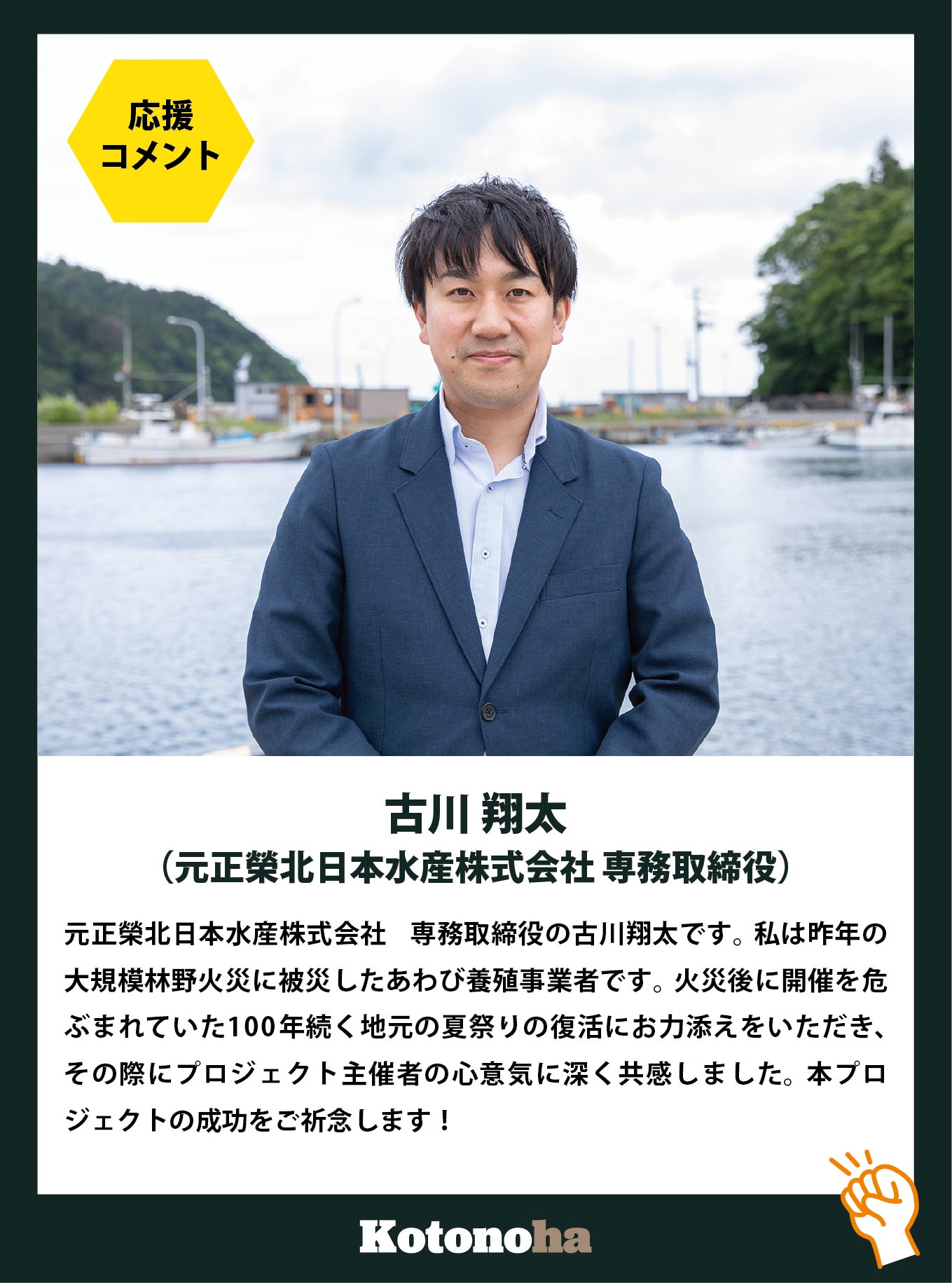 2026/04/08 21:26本日21時、新しいリターンプランを追加しました。能登の言の葉を残す|1本スポンサーあなたの1万円で、能登の言葉がひとつ、未来に残るプランです。このプロジェクトは、東日本大震災を経験したことから始まりました。あのとき、確かにそこにあった言葉が、時間とともに少しずつ失われていく現実を、私たちは見てきました。どれだけ大切な想いも、残さなければ、やがて届かなくなる。だからこそ“言葉を残す”という取り組みを続けています。そしていま、能登半島地震と向き合う中にも、日々の中に確かに存在している言葉があります。そのひとつひとつを、このまま失われていくものにしたくない。もうこれ以上、声を失いたくない。その想いから、今回のリターンプランをつくりました。このリターンでは、能登の語り部や当事者の言葉を、1本の映像作品として記録します。制作の過程も共有し、完成した作品をお届けします。そして、エンドロールにはご支援いただいた方のお名前を掲載させていただきます。その言葉は、これからを生きる誰かにとっての気づきとなり、命を守る行動につながるかもしれません。このプランは、ただの“応援”ではありません。ひとつの言葉を、未来に残すための具体的なアクションです。いま残さなければ、届かなくなるかもしれない。あなたの支援で、能登の言葉がひとつ、未来に残ります。ひとつの言葉を未来に残す、あなたの選択です。どうか、この取り組みに参加していただけたら嬉しいです。 もっと見る
