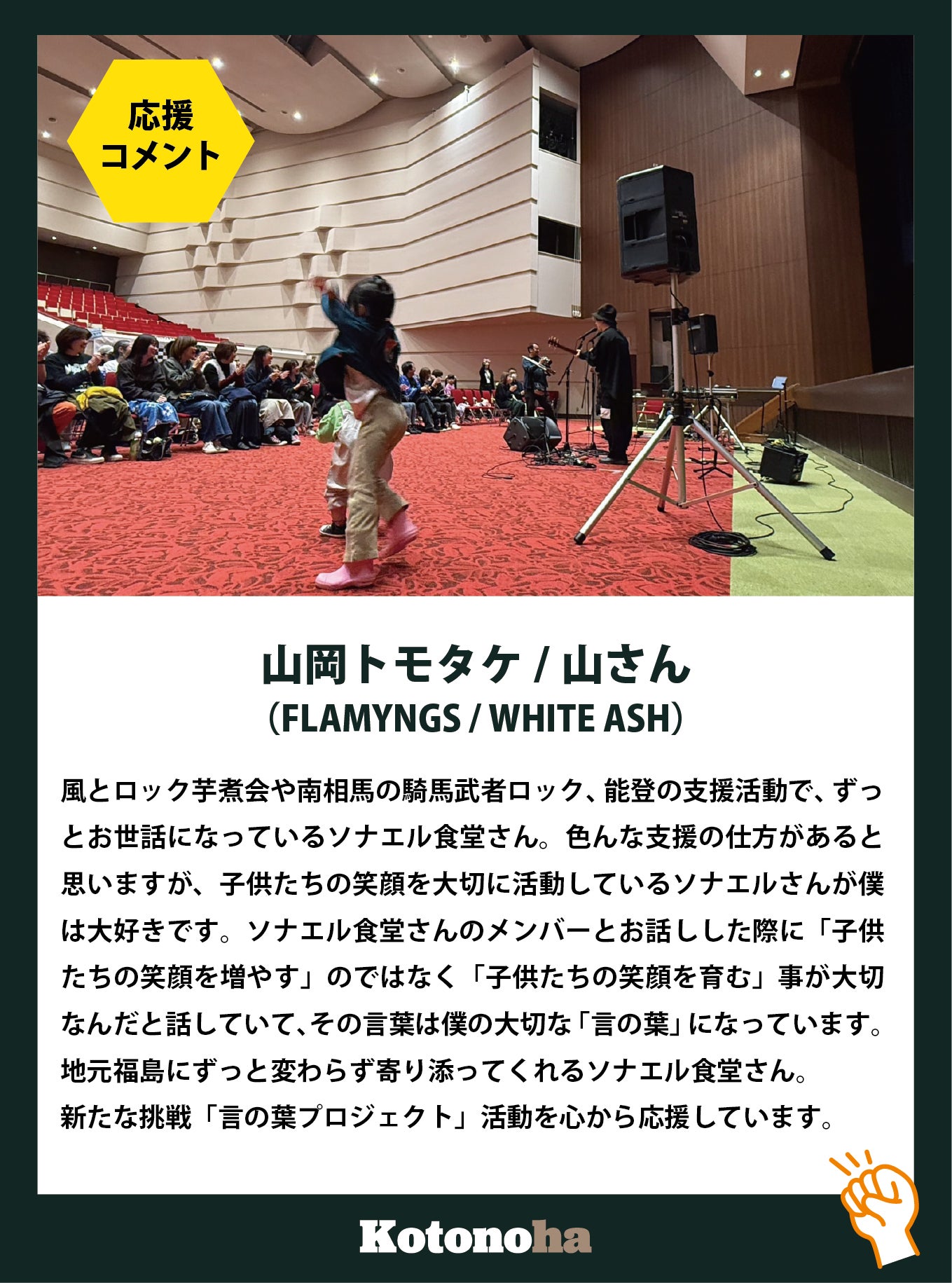 ライブという空間の中で、言葉と音楽が重なり合うことで、語りはより深く人の心に刻まれていきます。語りを一度きりの講話で終わらせない。音楽として生まれ、ライブで共有され、映像として記録され、SNSを通して広がっていく。言の葉プロジェクトは、語り部の言葉を社会の中で生き続ける文化として育てていきたいと考えています。