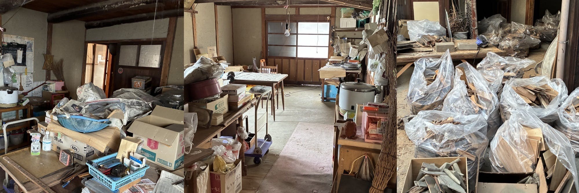 3ヶ月前、ここは長年放置された農具と埃(ほこり)に埋もれ、大量の物やゴミがある状態でした。まずはこの大量の荷物を運び出し、掃除することから始まりました。