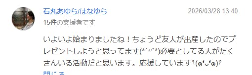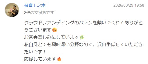 →いつもお声かけありがとうございます。子育ての不安に寄り添えるような冊子をお届けしたいと思います!リターン発送までしばらくお待ちください。