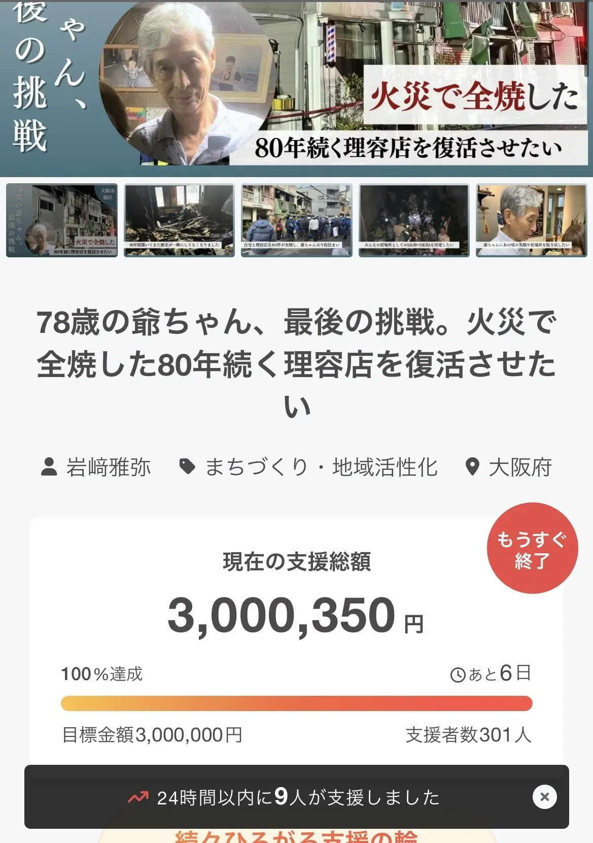 皆さまの支援が、爺ちゃんの理容店と、町の灯りをもう一度ともします。どうか、力を貸してください。