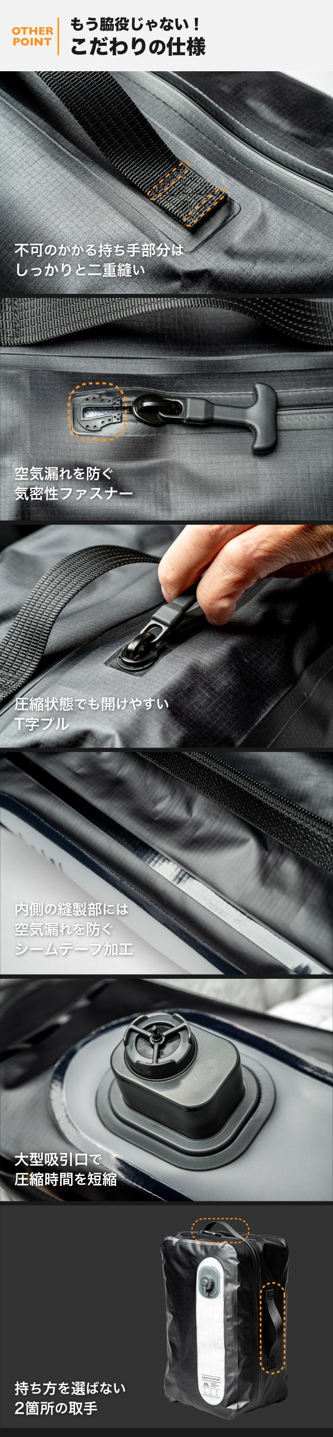 真空圧縮バッグ特有のファスナーや縫製もデザインの一部と考えて徹底的に追求しました。