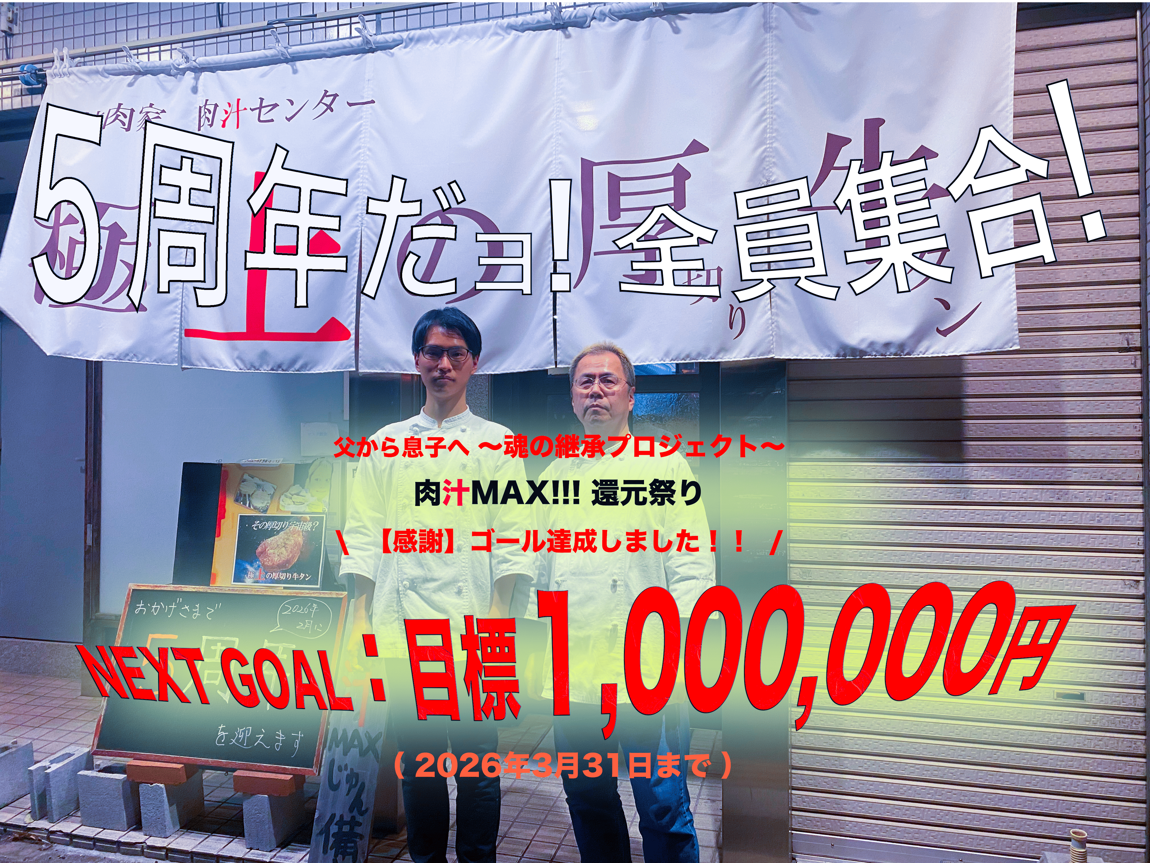2026/03/08 07:00皆様、本当にありがとうございます!!肉汁マスター イケタカです。3月2日にスタートした本プロジェクト。なんと、開始わずか数日で、目標金額【555,555円】を達成いたしました!!皆様からの熱いご支援と、温かい応援コメントの数々に、私と息子のシゲ、そしてスタッフ一同、厨房で震えるほど感動しております。しかし、ここで終わるわけにはいきません。皆様の期待に応えるため、そして「肉汁センター」の新しい伝説を作るために!次なる目標(ネクストゴール)を設定させていただきます。【ネクストゴール】支援総額:1,000,000円(100万円)そして、裏目標として……「CAMPFIRE フード・飲食店ランキング 日本一」を目指します!!※3/7(土) 23時現在、全国3位まで来ています!集まった追加の資金は、さらなる「極上肉の仕入れ」と、皆様をあっと驚かせる?!「5周年イベントの演出(サプライズ)」「新たなリターンの追加」など、全額、還元させていただきます。「たかが焼肉屋が、日本一?」そう笑われるかもしれません。でも、ここまで連れてきてくれた『あなた』となら、その頂上の景色が見られると信じています。どうか、最後まで、この祭りを一緒に楽しんでください。そして、一緒に「やったったぜ!」と笑い合いましょう!引き続き、応援よろしくお願いいたします!肉汁MAX!!!(ネクストゴール挑戦中) もっと見る