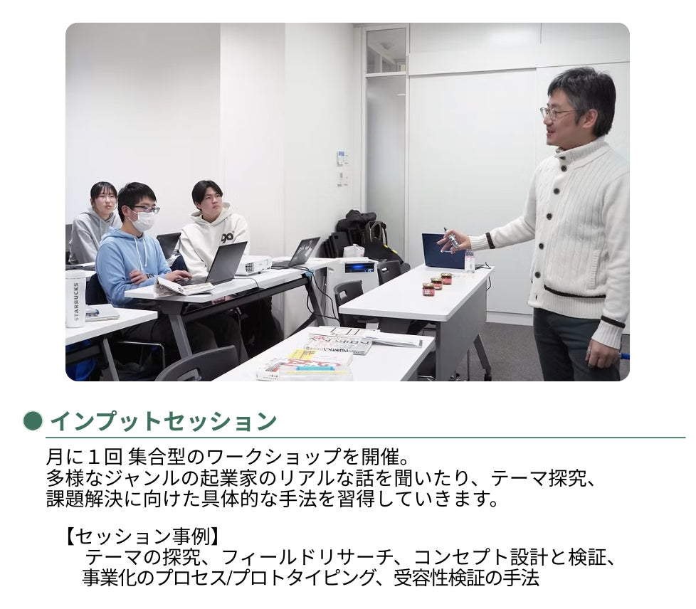 | ◾️ | インプットセッションの会場の提供 | 2026年度、学生が企業様へ訪問し、ご支援いただいた企業の社員の皆さまとともにインプットセッションを開催いたします。 企業様にとっても次世代との対話を通じて新たな気づきや社内活性化につながる機会となります。 |