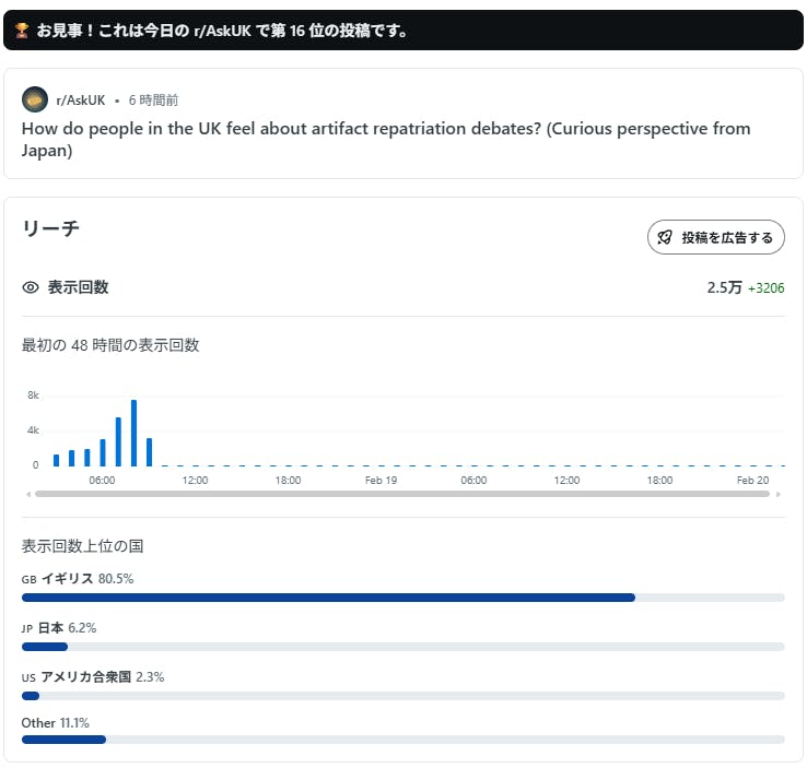 2026/02/18 18:25なんだかすごいことになったので、活動報告にて、一応…本プロジェクトが触れることになるテーマに「返還問題」というものがあります「イギリスの国際的な問題」という情報を、事前に調べて掴んだ気にはなっていたのですが実際にそこで生活する人にとってはどういう温度感で、どういう扱いをされるものなのだろう?と気になり・・・海外の掲示板の、イギリスコミュニティに投稿して直接聞いてきました。そもそも返還問題ってなんだろう?についてなのですが、私なりに、自国で置き換えれるものがないかと理解しようとしてみたところ、【隣国との間にある「この島、どっちの国に属しているの?」と重なる部分がある】こうしてみると、想像しやすいです。6時間ほど前に投稿して、イギリスの方に直接意見を聞いてみたところ、view数が画像の通り、とんでもないことになっていて・・・直接ゲームプロジェクトやキャンプファイヤーの情報にアクセスされたという話ではありませんが、現在進行形で議論して、理解を深めてます!ライブ感を感じれるかもしれないので、ご興味ありましたらこちらから覗いてみてください もっと見るプロトの”プロト”できました!