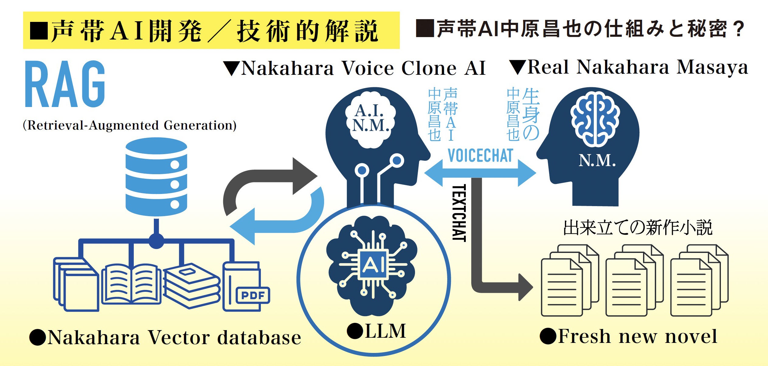 中原昌也の全ての小説と自伝と膨大な批評とインタビュー(約30冊とテキストデータ数百万字)を、その作家性を解析しな がらナレッジベースとなる" 中原昌也知識ベース"として構築し、LLMをRAG(Retrieval-AugmentedGeneration) で拡張。ベクターベースを宇川直宏&DOMMUNEが育てUPDATEし続けます。また本人の生声を大量にキャプチャーし、 AIアルゴリズムによる解析を施し、声紋をクローニング。スピーチシンセサイズを果たし、ボイスクローン/デジタルツイン としての「声帯AI中原昌也」を生み出します。「生身の中原昌也」は「声帯AI中原昌也」とボイスチャット的にコミュニケーション をしつつ、共に「SOUND TO SOUND(TO TEXT)」の対話形式で小説を音声ファイルで描きまくる!!ボイスと並行でテ キストチャットも連動していて、中原昌也のベッドルームから編集者のもとに出来立てほやほやの新作小説が活字で届きます!!!
