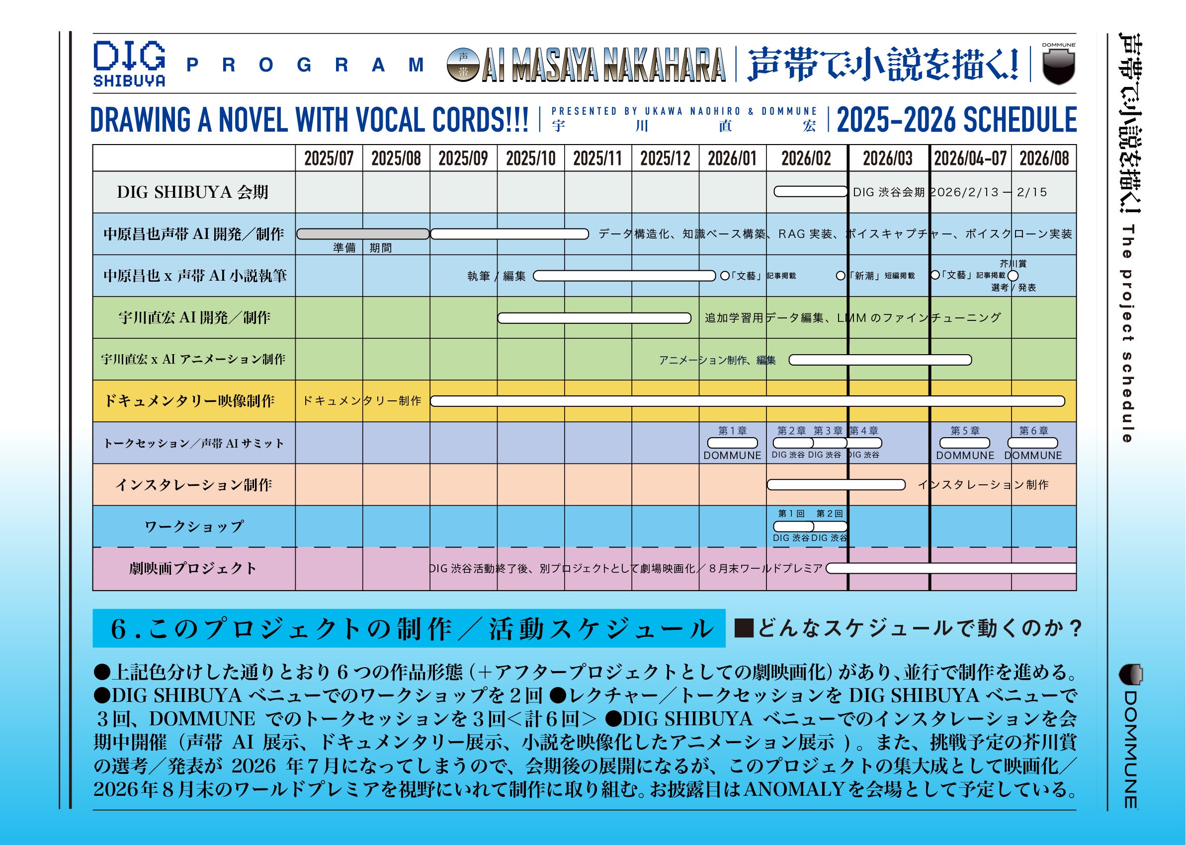 インスタレーション作品「声帯A I 中原昌也」と共に対話形式で描く小説講座「あなたの声帯で小説を描く! 」を一般者向けのワークショップとして@DIG SHIBUYA ベニューで展開(DOMMUNE & PBOX)。そこで参加者がA Iと共に描いた小説を今度はプロンプト化し、A I 宇川直宏と共に動画化する「あなたの声帯で小説を動かす! 」を会場で同時展開。世界でも類を見ないワークショップシリーズを渋谷で展開し、生成A Iと共生しながら嘗て体験したことのない身体感覚から生み出される創作のネットワークを共有します。これは生成A Iと共生する時代の“もう一つの身体性” を発見する試みであり、声の震えが物語へと成長し、視覚イメージへと再生成される新たな創造の実験場です。年齢・性別・国籍・言語、そして障がいの有無を問わず、誰もが生成/ 創造できる超ダイバーシティ・声帯ワークショップなのです! !