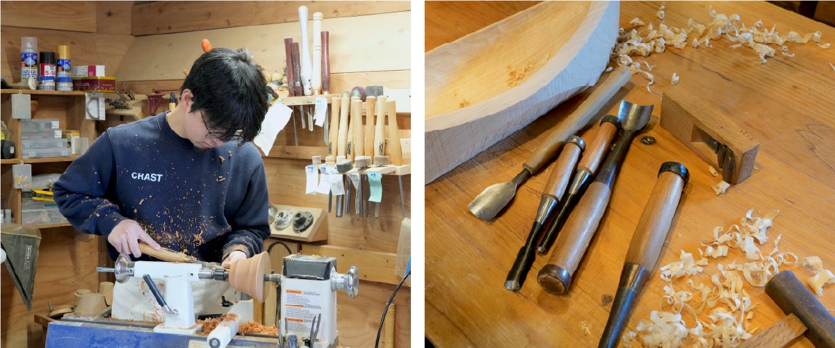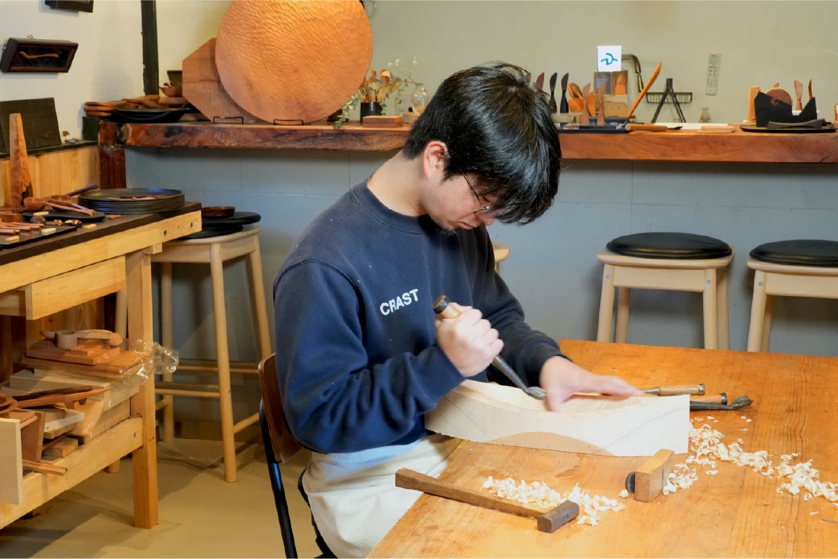 お皿等を制作したときに出る廃材を活用しています。木質や節目などを見極め、丁寧に切り出します。木は大切な資源。余すことなく使い切ります。