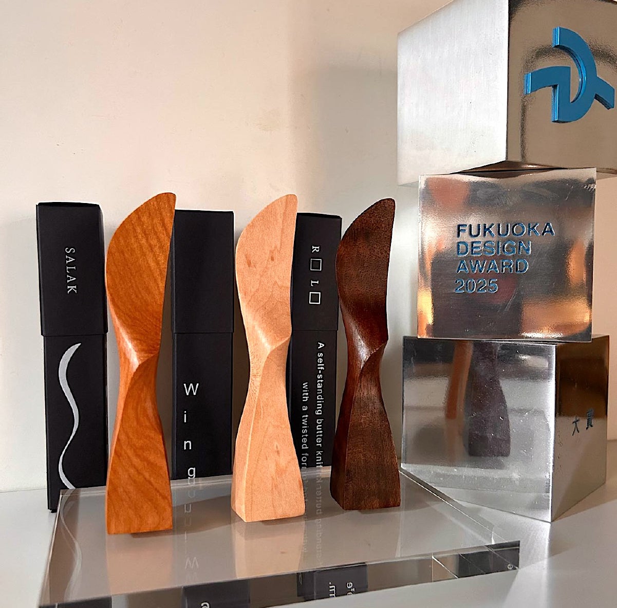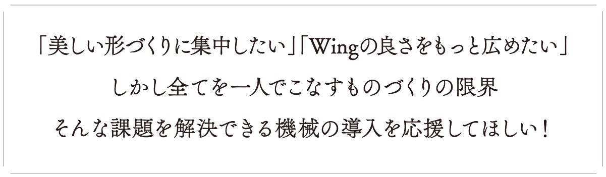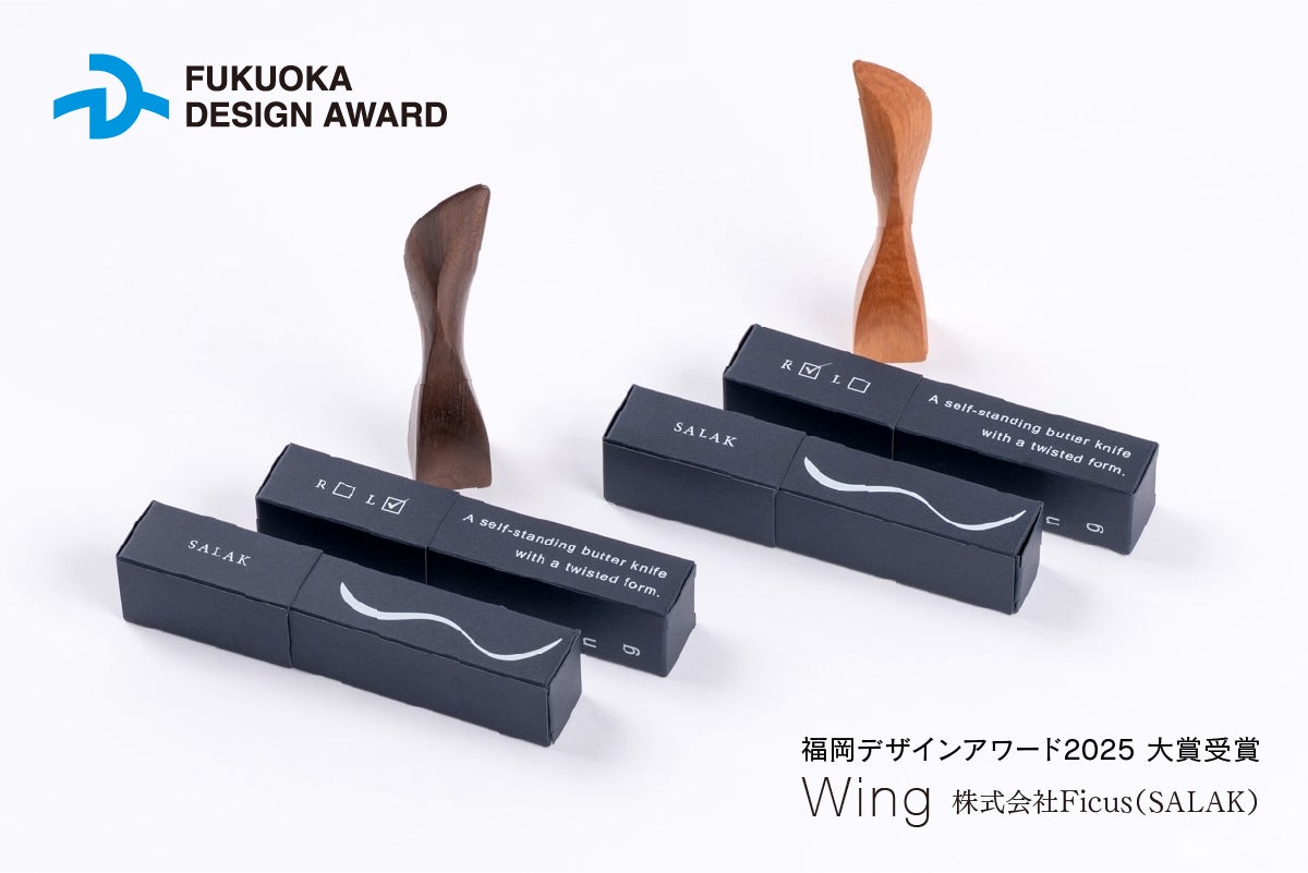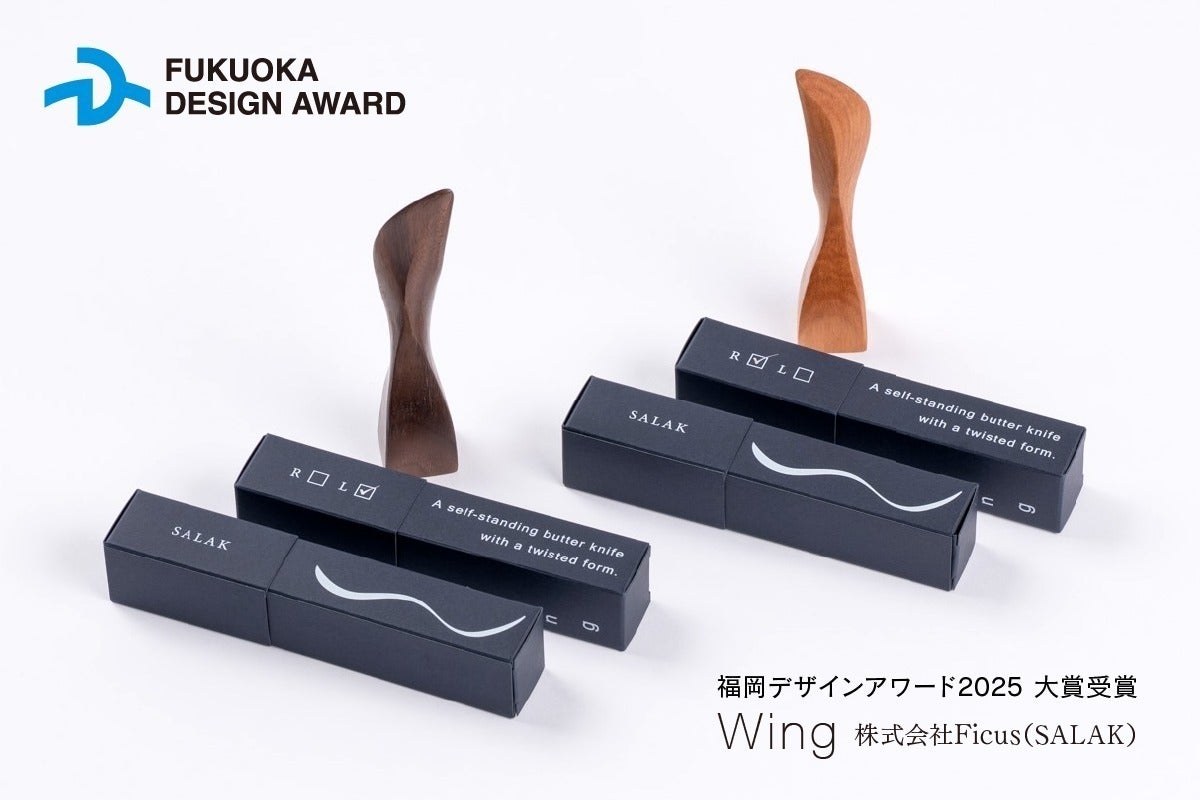 この度、自立するバターナイフ「Wing」で、福岡デザインアワード2025の大賞を受賞しました。これをきっかけとして、九州産木材を使った美しい木製食器たちを、もっと広く知ってほしいと考えています。一人きりの職人の仕事なので、大量生産とまでは行きませんが、高機能な機械の導入によって、作業効率を上げて研ぎ澄ました手仕事のみに専念出来るようになります。