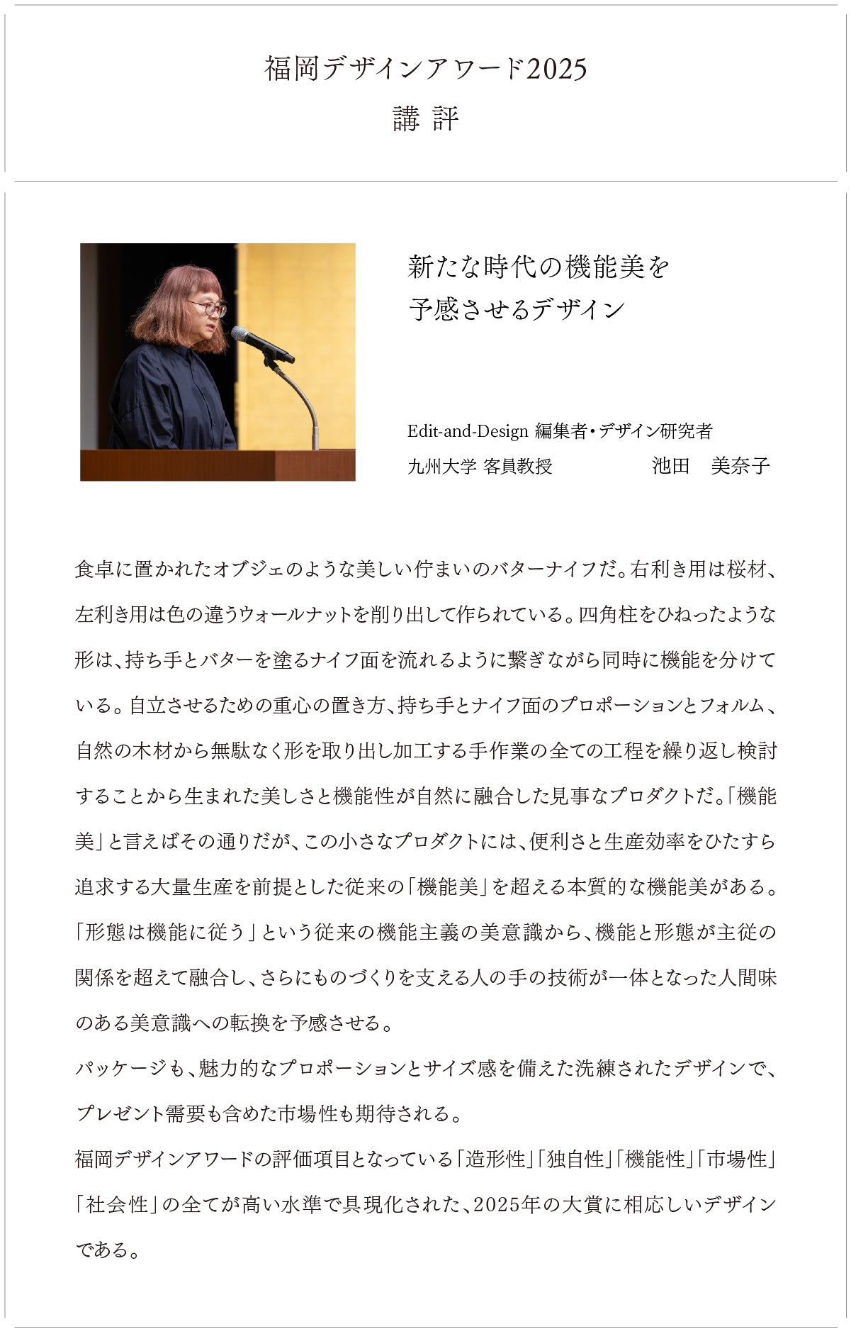 この度は大変名誉ある賞を賜り、誠にありがとうございます。本製品は、地域資源の有効活用と衛生性を両立させるため、九州産木材や廃材を活かし、 職人の精緻な技術によって形づくられました。今後は、生活用品における環境配慮型デザインの可能性をさらに広げ、地域とものづくりの価値向上に取り組んでまいります。