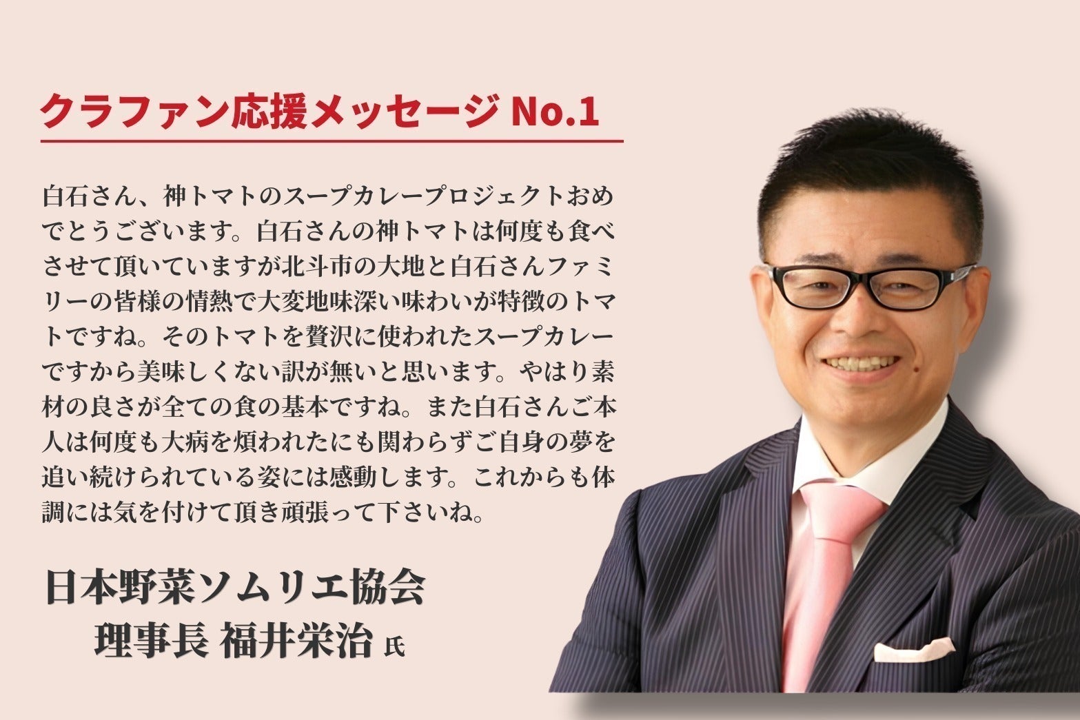2026/04/05 15:00活動報告をご覧いただき、ありがとうございます!北斗市で115年続く歴史を背負い、2026年より「株式会社北斗市白石農園」として新たな一歩を踏み出した、5代目の白石敏明です。現在、クラウドファンディングは60%を突破し、日々多くの方から熱い応援メッセージをいただいています。「白石さんの情熱に心を打たれました!」「北斗市の新しい名所になるのを、家族みんなで楽しみにしています」「苦難を乗り越えて挑戦する姿に、勇気をもらいました」また、野菜・果物の目利きや栄養、料理法などの知識を持つ「野菜ソムリエ」を育成・認定する日本野菜ソムリエ協会の福井理事長からもメッセージを頂きほんとうにありがとうございます。こうした一言一言が、私にとって何よりのエネルギーです。11歳で大腸を全摘し、18回の入院を経験した私ですが、これほどまでに誰かに期待され、背中を押してもらえる今、当時の自分に「未来は明るいぞ」と伝えてあげたい気持ちでいっぱいです。私は、この応援という名の「情熱」を、最高の一皿に変えて恩返しをします。自慢の神トマトや旬の野菜。そして、体に優しくエネルギーが湧いてくる5分付き精米のお米。農家だからこそ届けられる、命を繋ぐスープカレー店を必ず形にします。私は、北斗市、そして北海道を照らす「太陽」のような男になると決めました。皆様からいただいた光を、今度は私が大きな熱量に変えて、地域全体へ届けていきます。 もっと見る