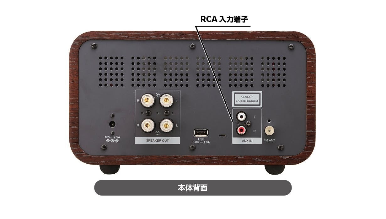 外部入力は2系統を装備しました。フロントには3.5φミニステレオ入力端子、背面にはRCA入力端子を装備していますから、フォノイコライザー内蔵のレコードプレーヤーなども接続して楽しめます。