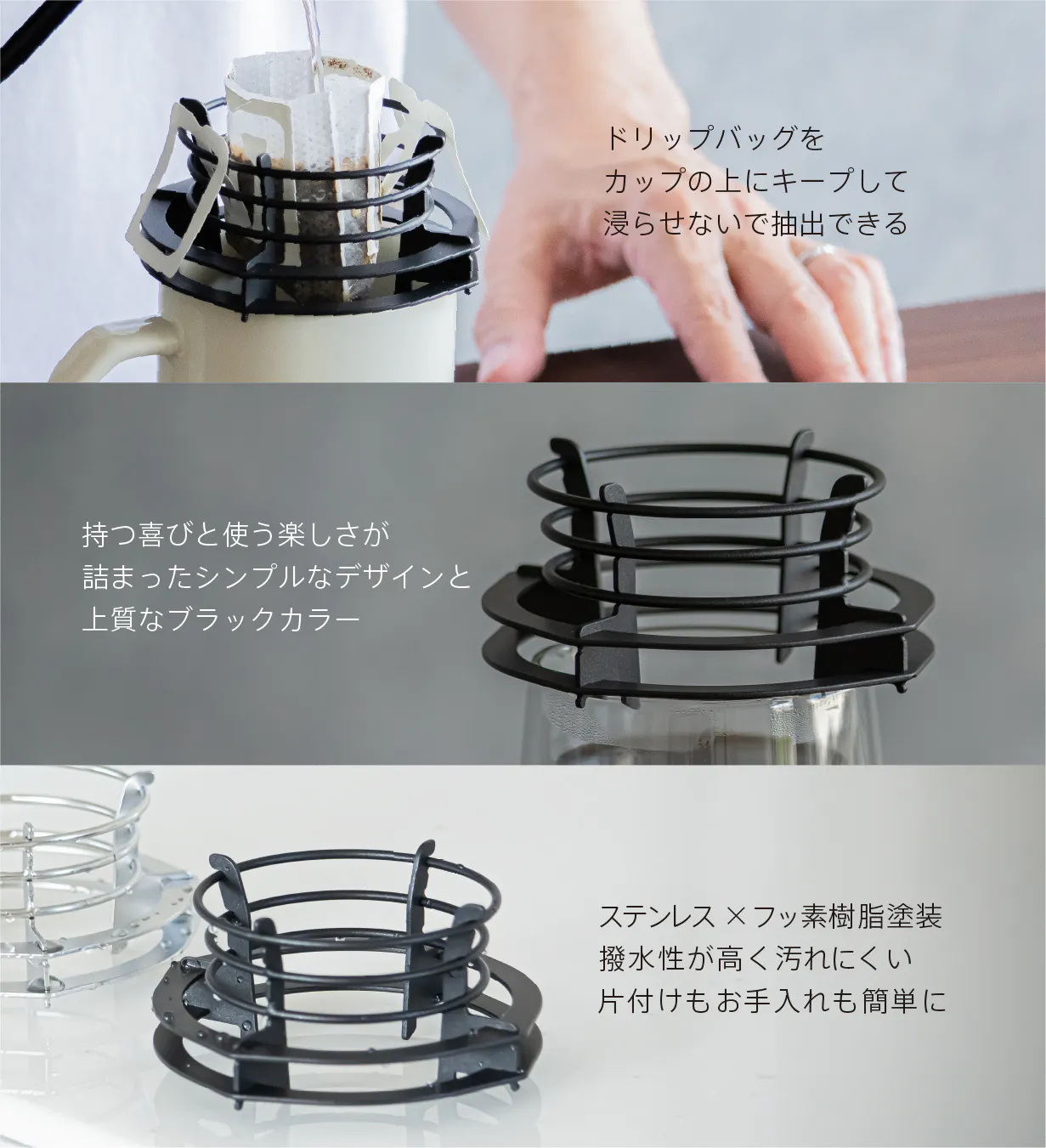 ドリップバッグコーヒーは、お湯にコーヒー粉を浸して抽出する「浸漬式」。手軽ですが、「ドリップバッグがカップ内で湯に浸っているのが気になる」、という方も多いはず。また、浸かっている分、成分が出すぎて過抽出になりやすいという声もあります。