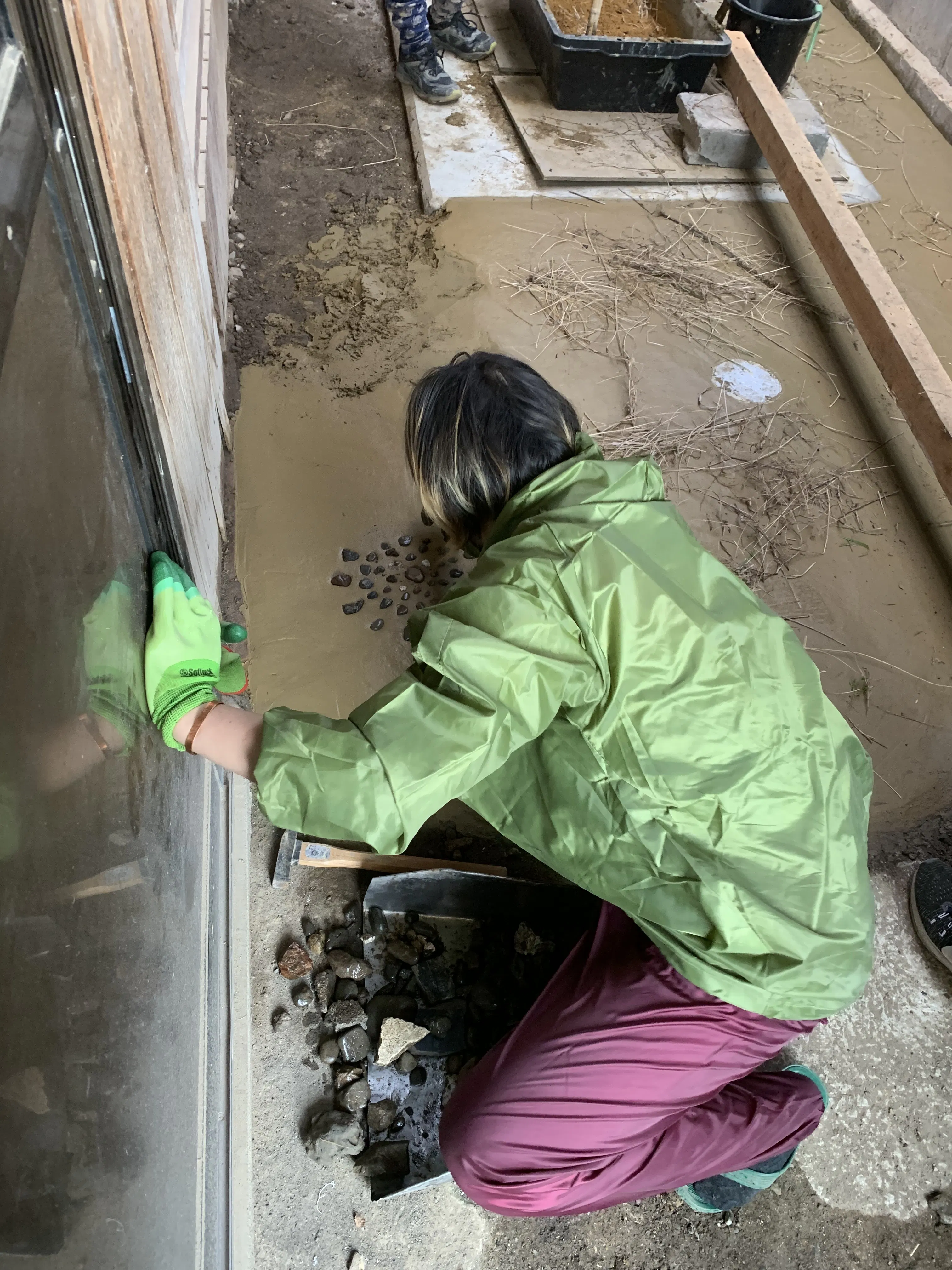 床の模様も手作りです。拾ってきた流木や、庭の石をはめ込みました。