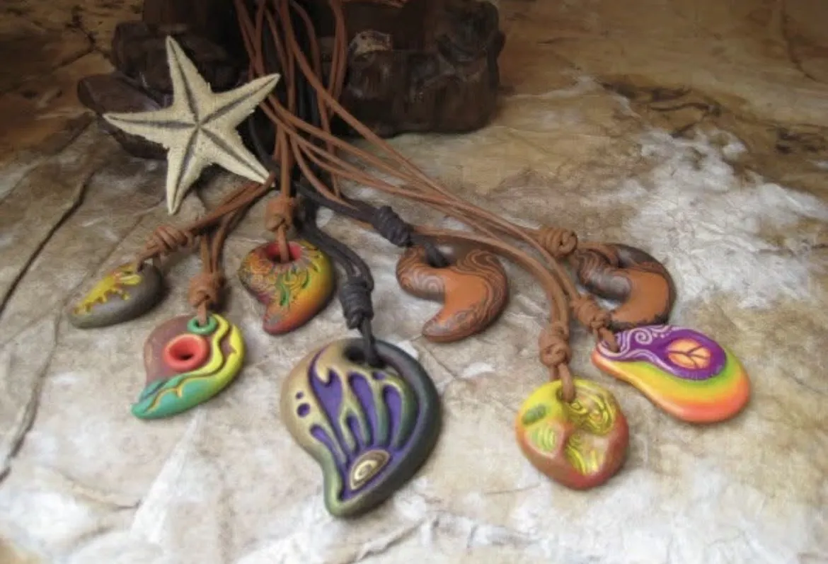 earthmaniaの勾玉アクセサリー。その当時、パイレックスガラスアートのアクセサリーが大好きで、その表現を陶土を使ってできないかと試行錯誤する日々。テーマを決めて、そのイメージに合った形を作り上げていく工程がとても楽しかった。
