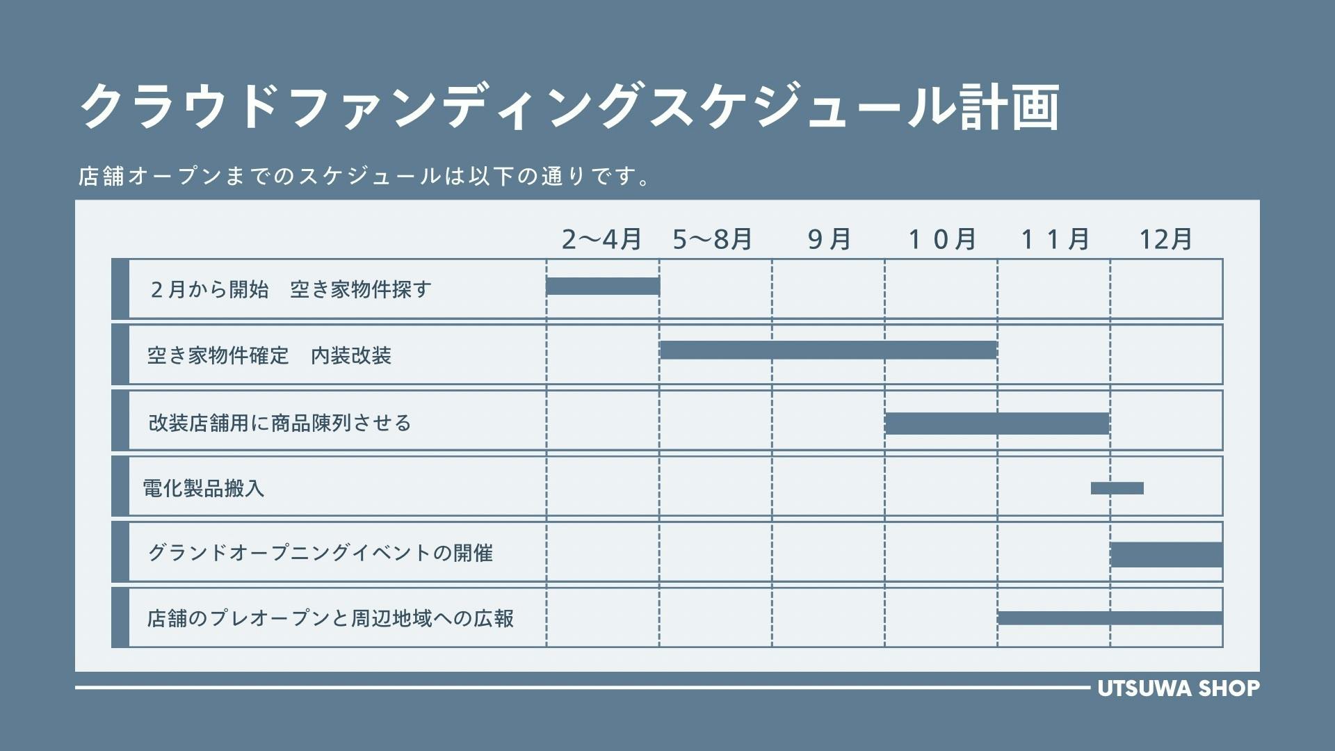 2026年2月から4月頃までの2ヶ月間でクラウドファンディングを実施いたします。目標達成後は速やかに店舗の準備を始め、秋頃には新しい土地でのサービス開始を予定しています。設備の導入や各種工事の準備を進めながら、一日でも早く皆さまのお役に立てるよう努めます。