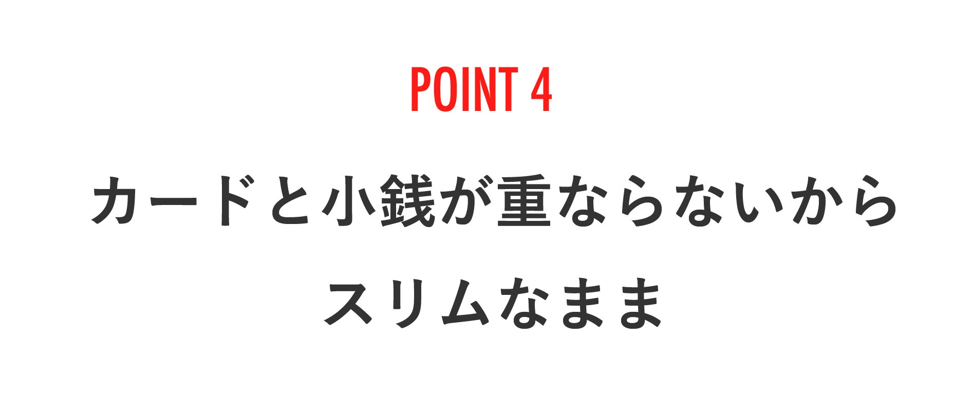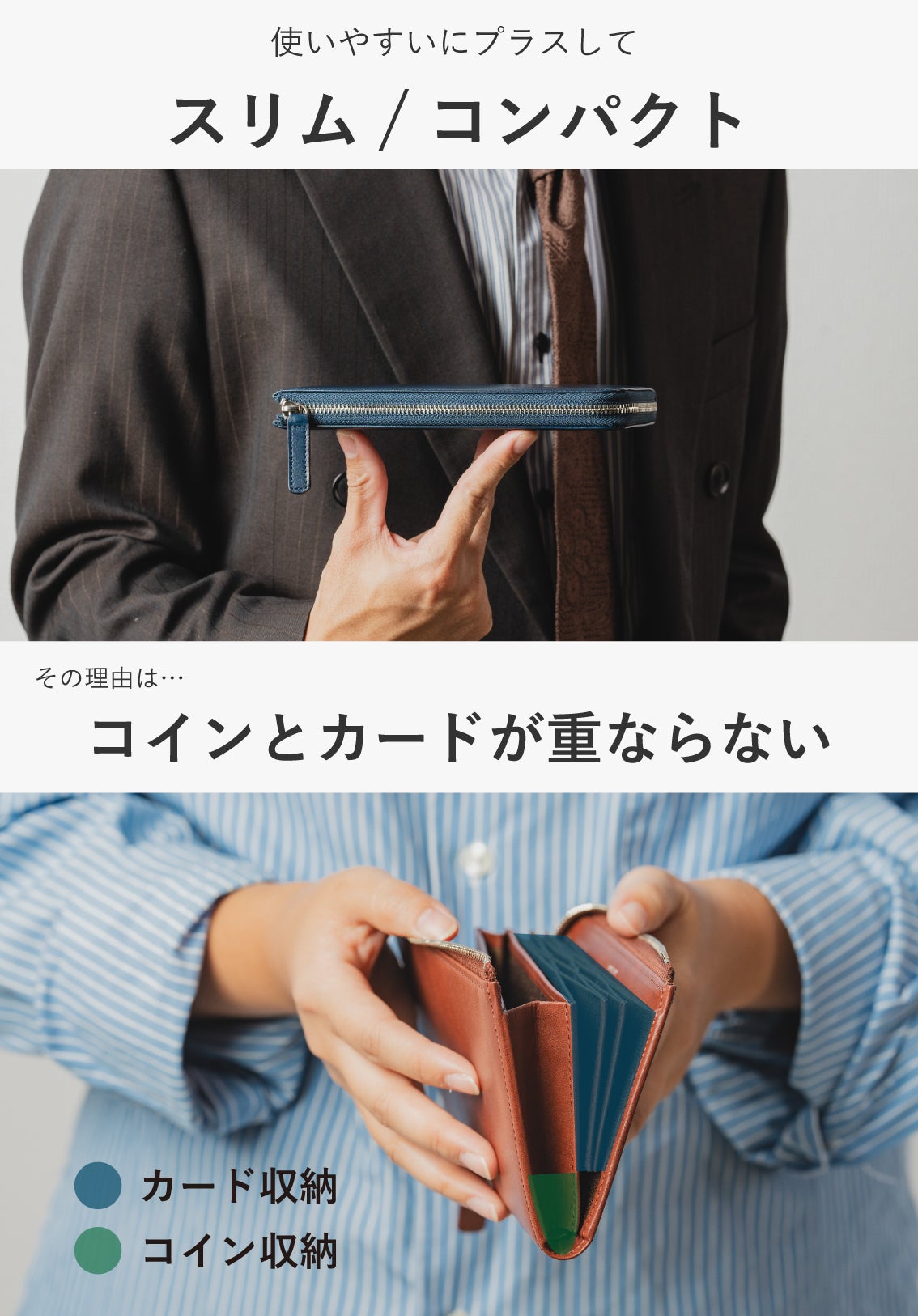 カードと小銭が重ならず、小銭の厚みがカード室下のスペースに逃がせる、中身を入れても膨らまない構造を採用しています。