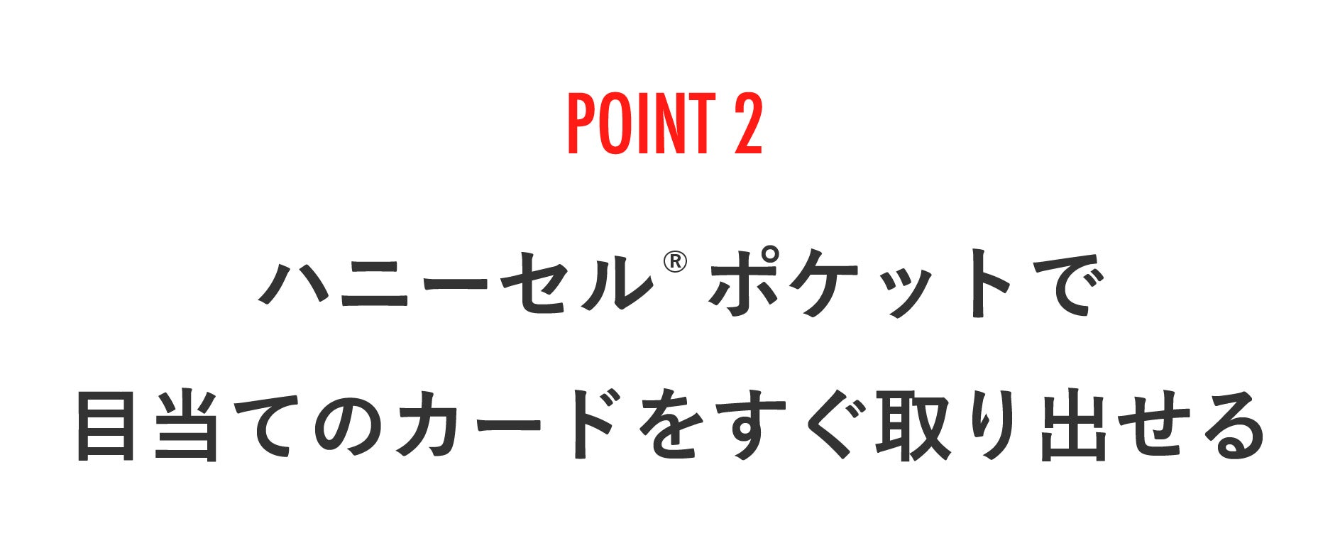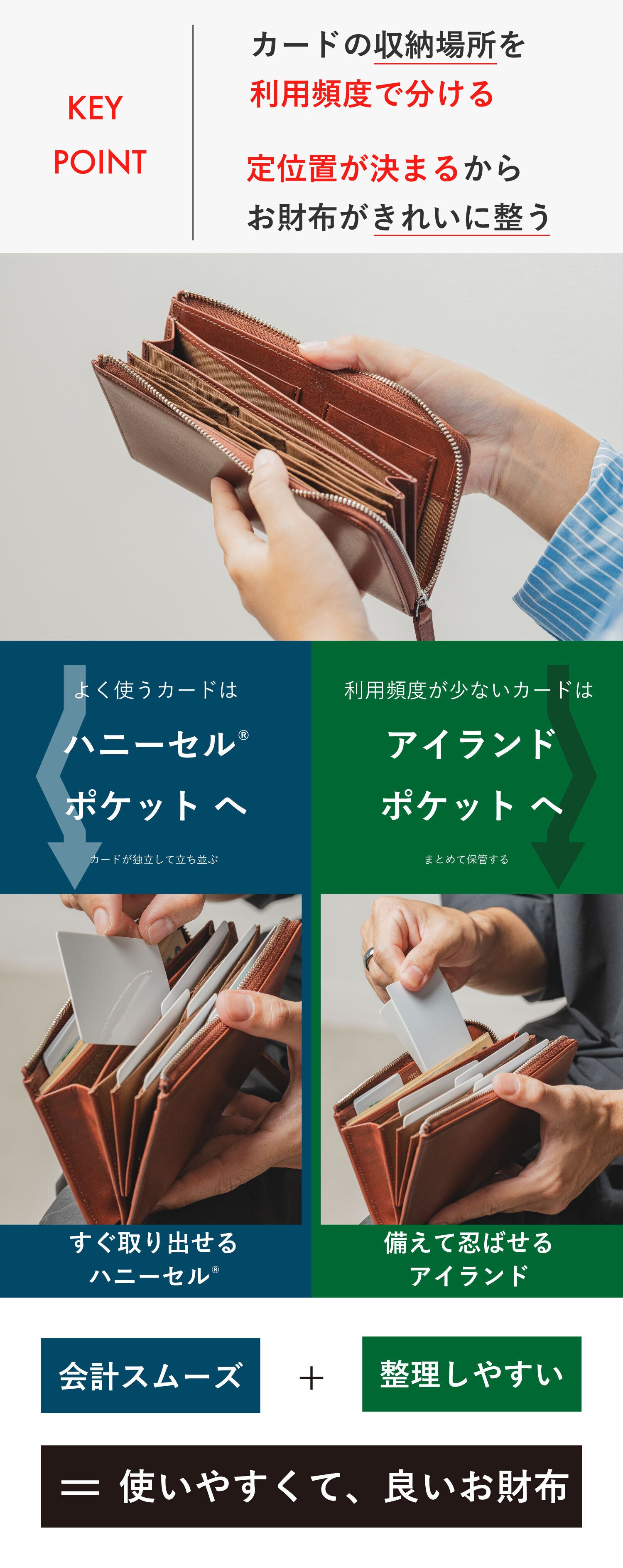 さらに後述のハニーセル®構造でカードが交互に立ち並ぶため、カード・お札・小銭がどれも視認性抜群。パッと開いて見やすいのが特長です。