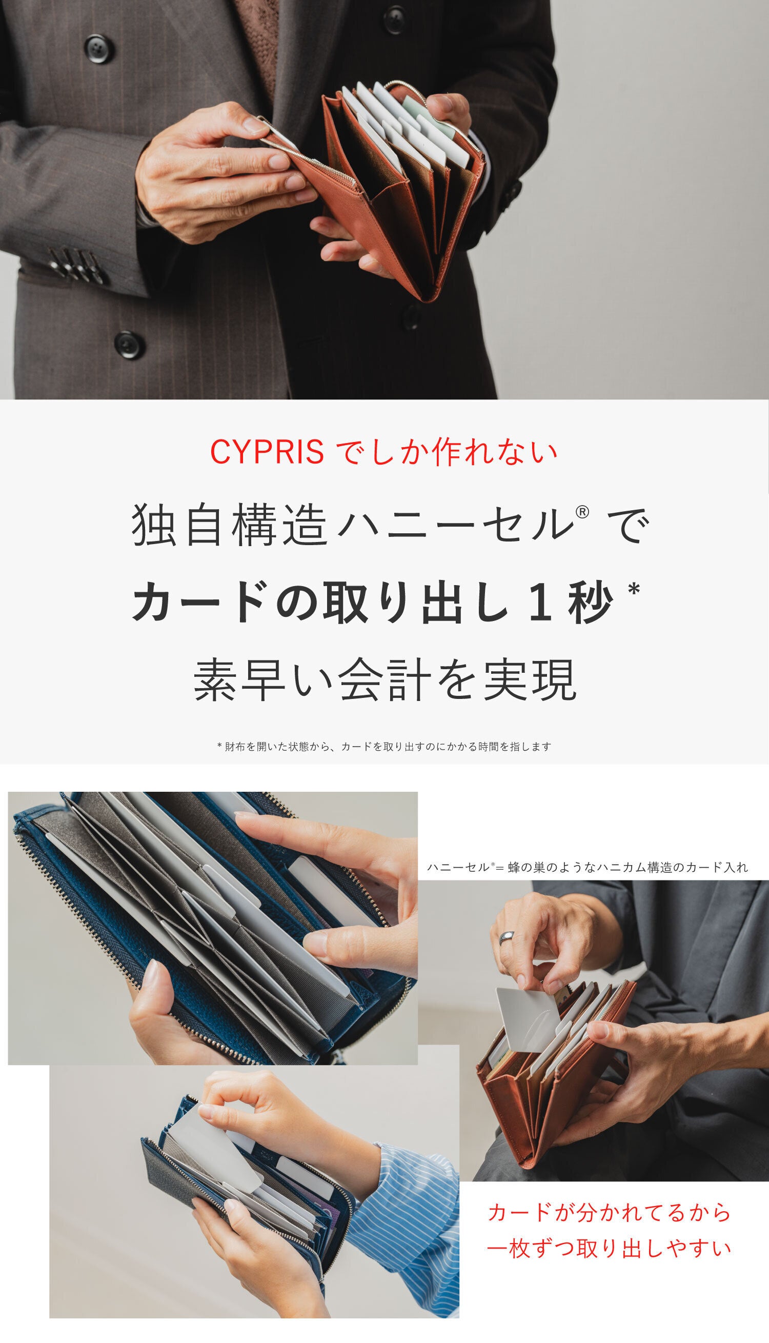 メインのカード収納に採用したハニーセル®構造は、カードが取り出しやすいと定評があり、累計販売実績数21万個以上にのぼるCYPRISの独自構造。
