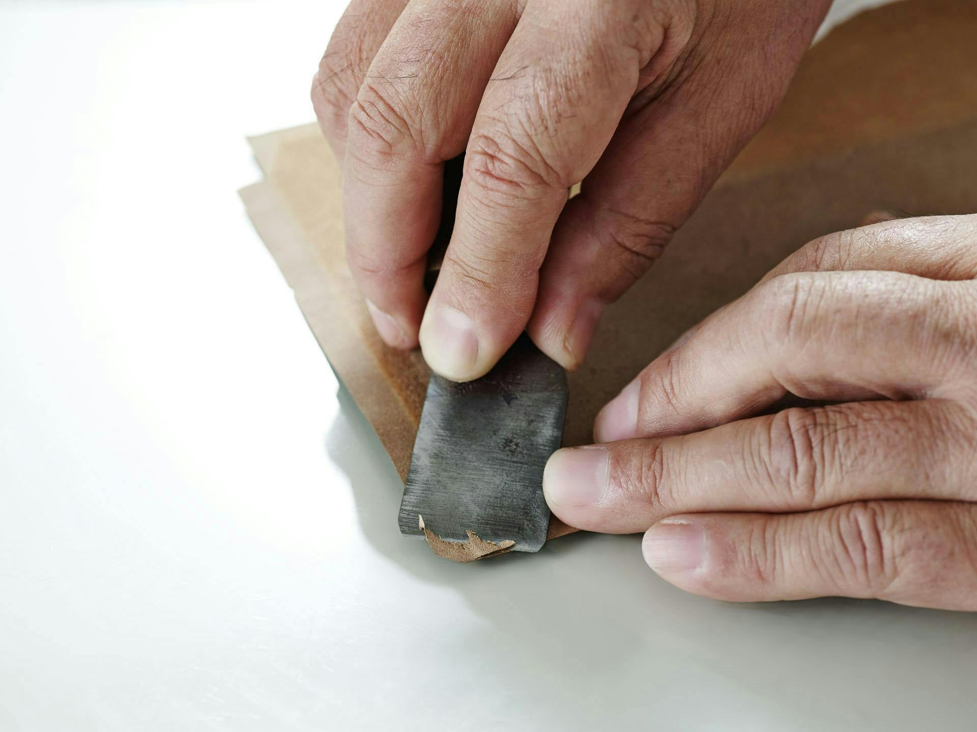 型紙の制作ひとつをとっても、財布内部の空間を立体的に想像し、革の厚みや特性を考慮しながら丁寧に作り上げていく、長年の経験があってはじめて成立する高度な技術です。この型紙の精度が以降のすべての工程に影響を与えるため、サンプルの段階から一切妥協せず、丁寧に一つひとつと向き合うことが、最終的な高いクオリティへとつながっています。