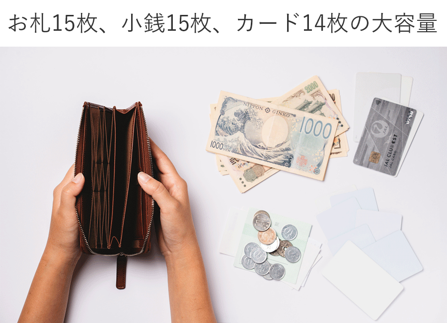 お札15枚、小銭15枚、カード13−14枚まで快適に収納できます。