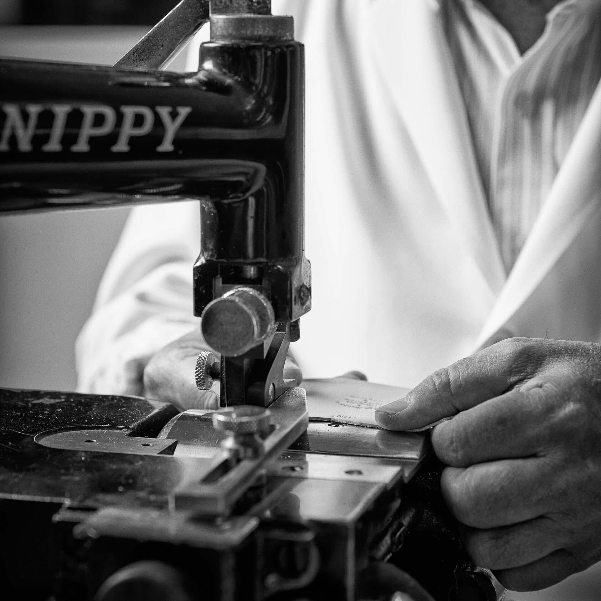 CYPRISのものづくりで特筆すべきは、サンプル制作から量産に至るまで、すべての工程を自社内で完結させているという点です。一般的に革小物の製造では、裁断・漉き・縫製などの工程ごとに外注に出して分業するケースが多い中、CYPRISは型紙の制作から最終的な仕上げまでを、すべて自社の職人が担います。