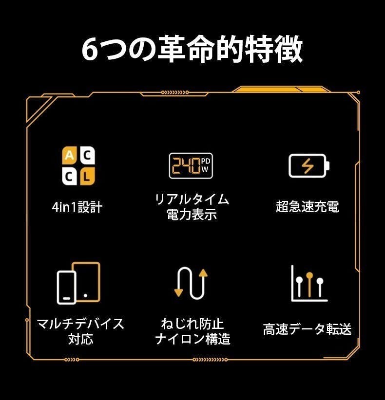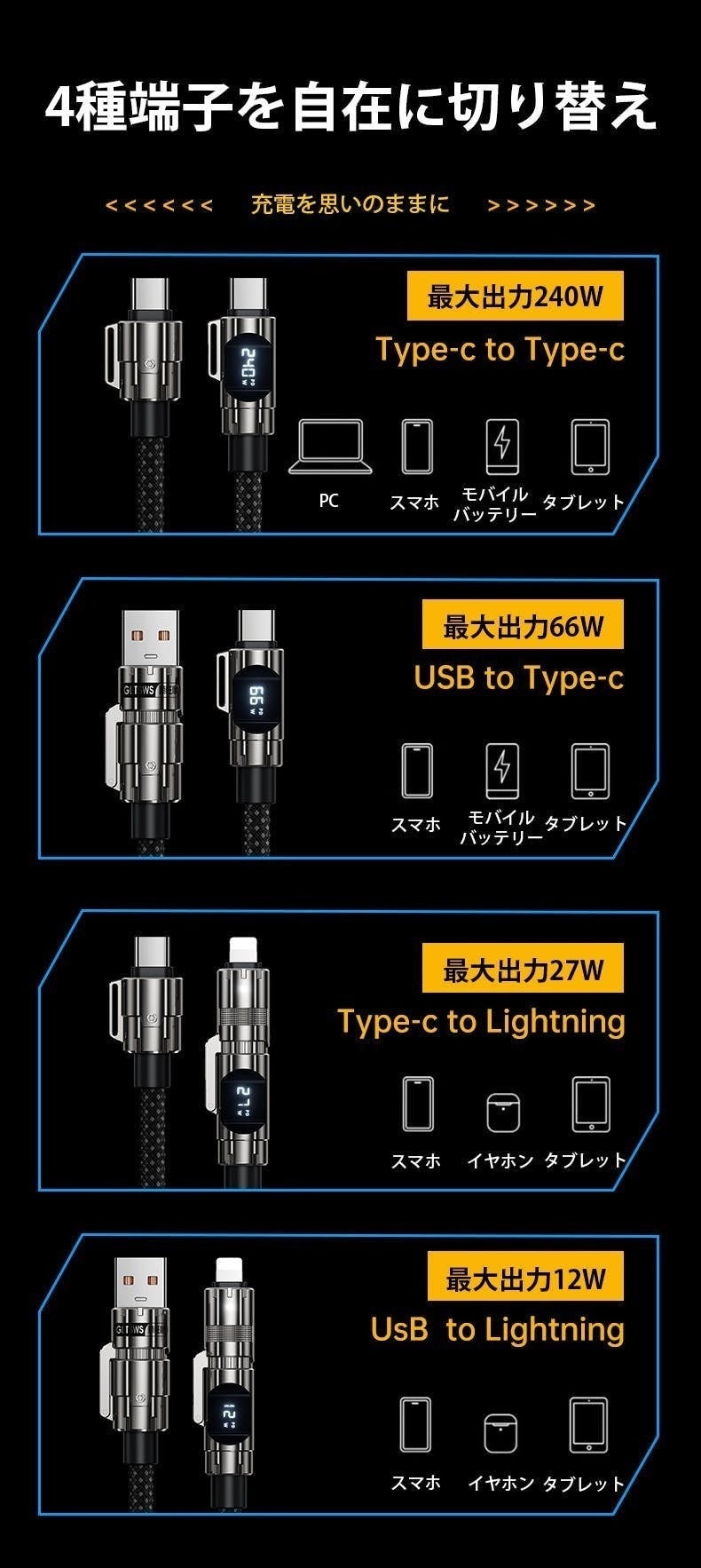 本製品は4種類の端子を1本に集約しているため、スマホ・ノートPC・タブレット・ゲーム機まであらゆるデバイスをこれ1本で充電でき、複数のケーブルを持ち歩く手間から解放されます。
