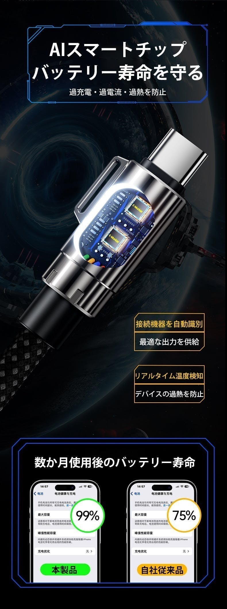 太い純銅ケーブルを採用しているため、電力伝達効率が高く発熱を抑えられる上、長期間の使用でも劣化しにくく、常に安定した充電性能を発揮します。