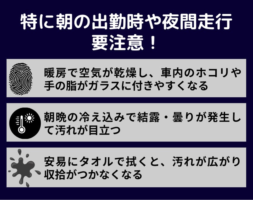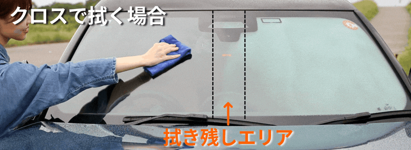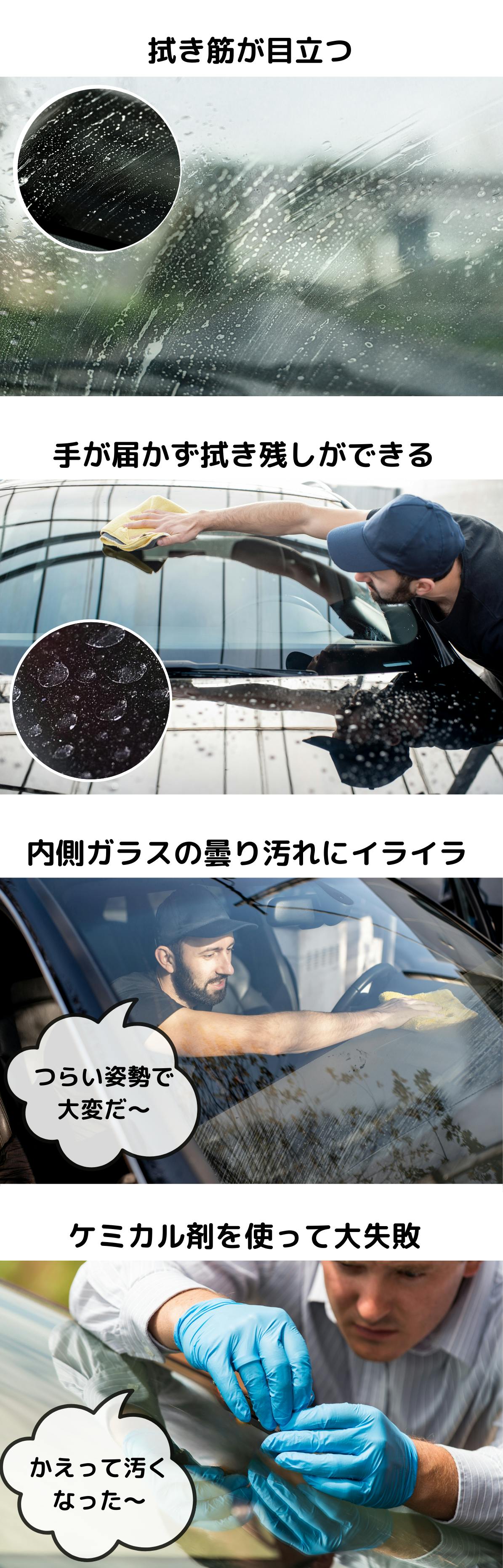 また、愛車のフロントガラスは傾斜がきついため、ガラスの内側を拭くこと自体が大変な上、安易に汚れたタオルで拭こうものなら、曇り汚れを広げるばかりでうまくいきませんでした。