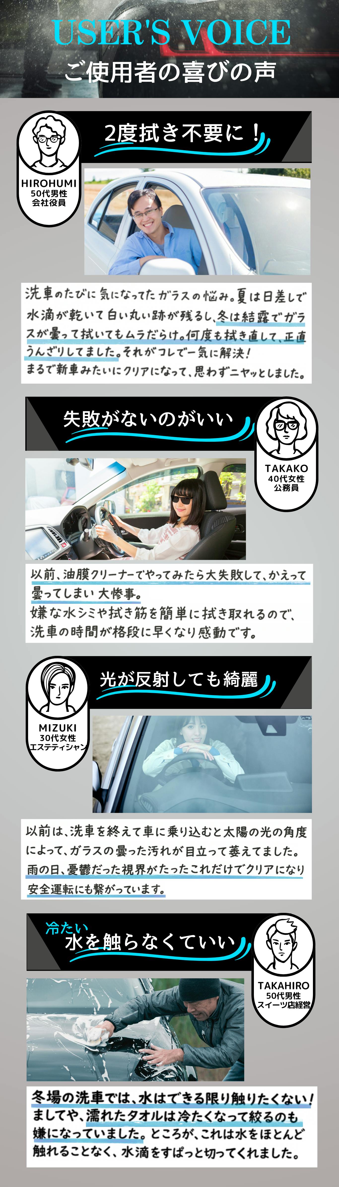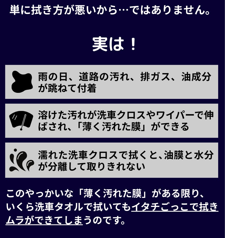 私は洗車グッズの企画をしているくらいなので、洗車は得意なはずなのですが、ボディはピカピカになるのに、なぜかフロントガラスだけは拭きムラや拭き筋が残ってしまい、運転中に見つけるとがっかりすることが多々ありました。