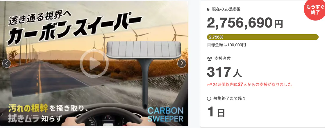 2026/03/30 14:35サポーターの皆様へここまで温かいご支援と応援をいただき、誠にありがとうございます。カーボンスイーパープロジェクトは、いよいよ【明日で終了】となります。https://camp-fire.jp/projects/924563/view今回のプロジェクトを通じて、あらためて感じたのは、「洗車に対する価値観は人それぞれでありながら、“もっとラクに、もっと気持ちよく仕上げたい”という想いは共通している」ということでした。ひと手間のストレスを減らすことができれば、洗車そのものの体験は大きく変わると考えています。カーボンスイーパーは、そんな日常の中の“ちょっとした不満”に向き合い、できるだけシンプルに、合理的に解決できるよう設計しました。ここまで多くのご支援をいただけたこと、そして様々なお声をいただけていることに、心より感謝申し上げます。まだご検討中の方がいらっしゃいましたら、この機会にぜひご参加いただけましたら幸いです。最後の一日となりますが、引き続きどうぞよろしくお願いいたします。株式会社ファンタベース もっと見る目標の30万円を突破!心より感謝申し上げます。