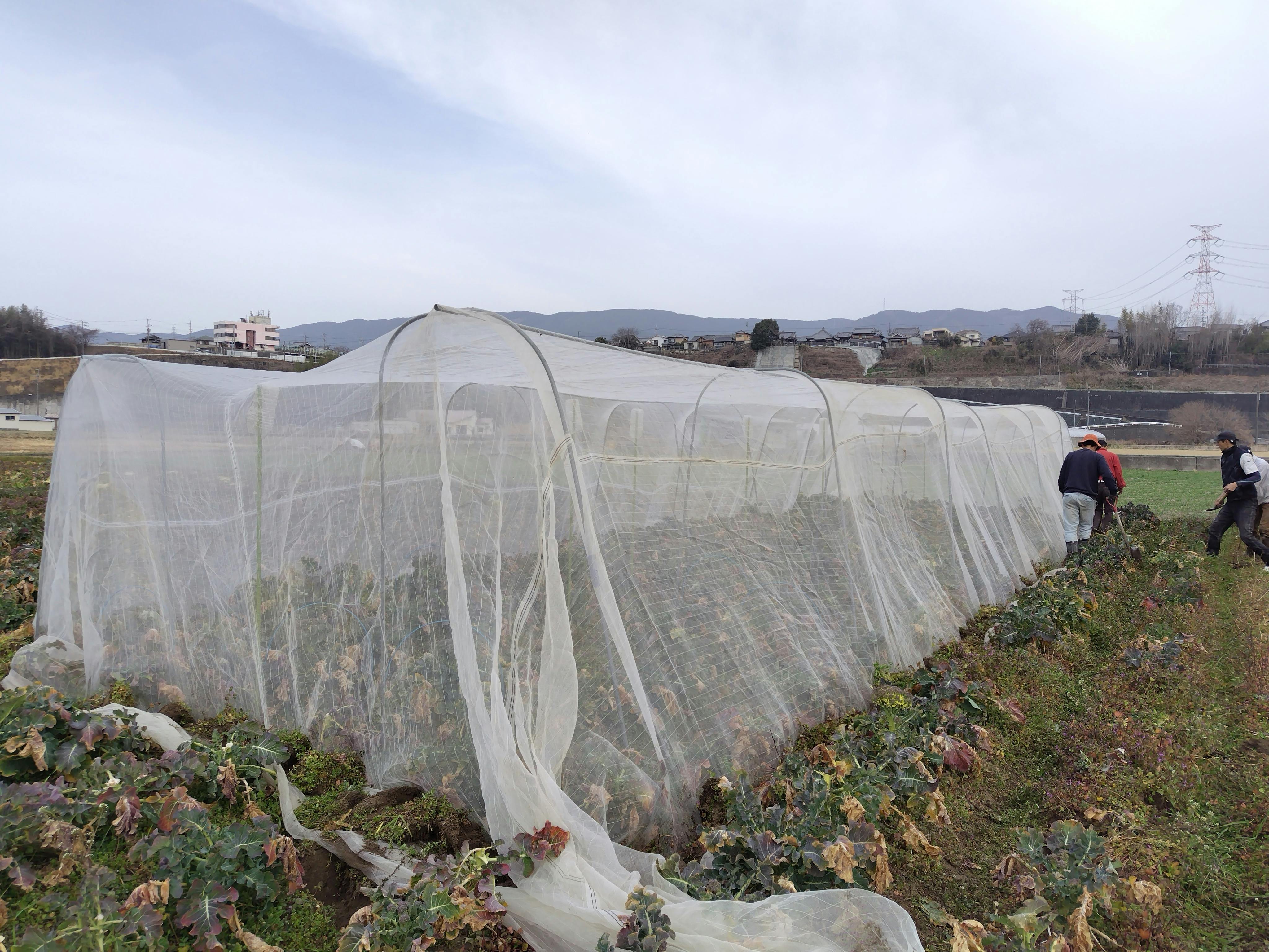 この写真は、先日作業を終えたブロッコリーの自家採種の様子です。 ブロッコリーの「母本(ぼほん:種を採るための親となる株)」に、大きな交雑防止ネットをかけています。