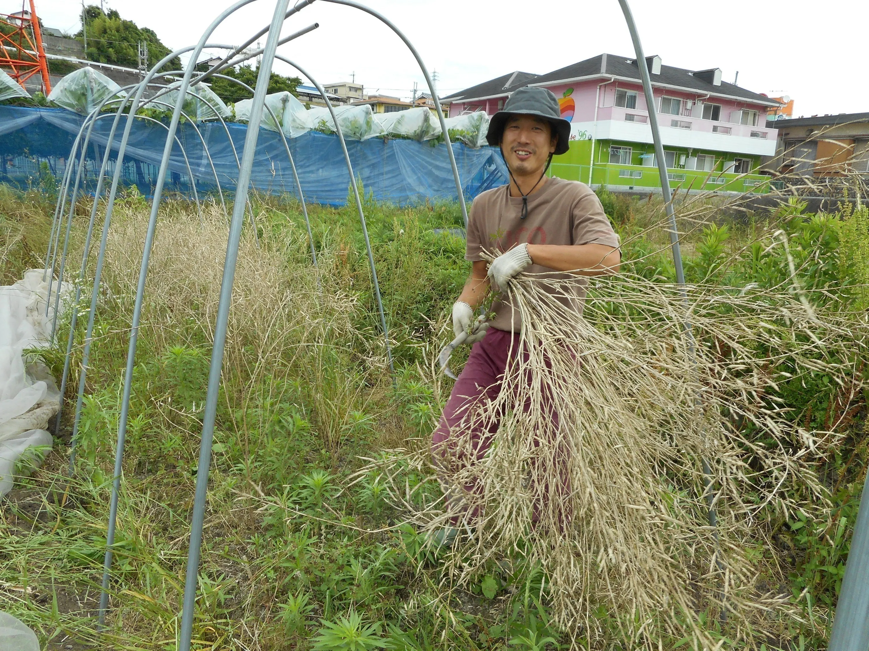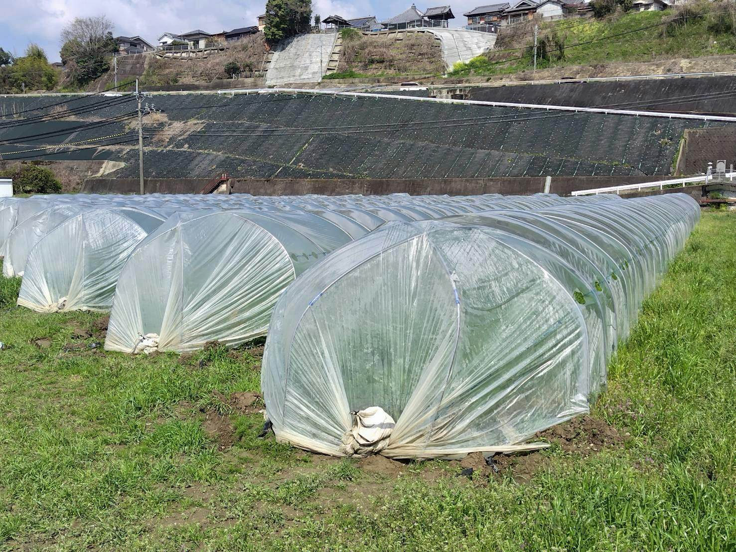 そこで、クラウドファンディングで頂いた支援金で、下のような大型トンネル(小型のビニールハウス)をたくさん設置して、大量の種を採種できるようにしていきます。