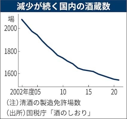 日本国内での日本酒消費量は年々減少しており、酒蔵は直近20年で約4割減少したとも言われています。