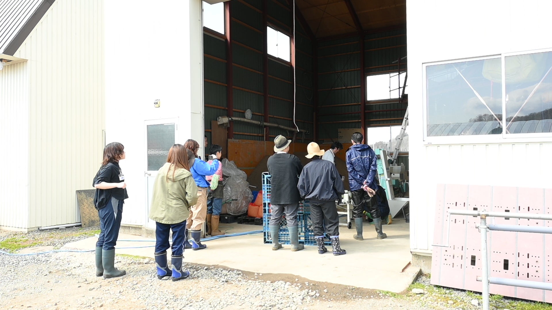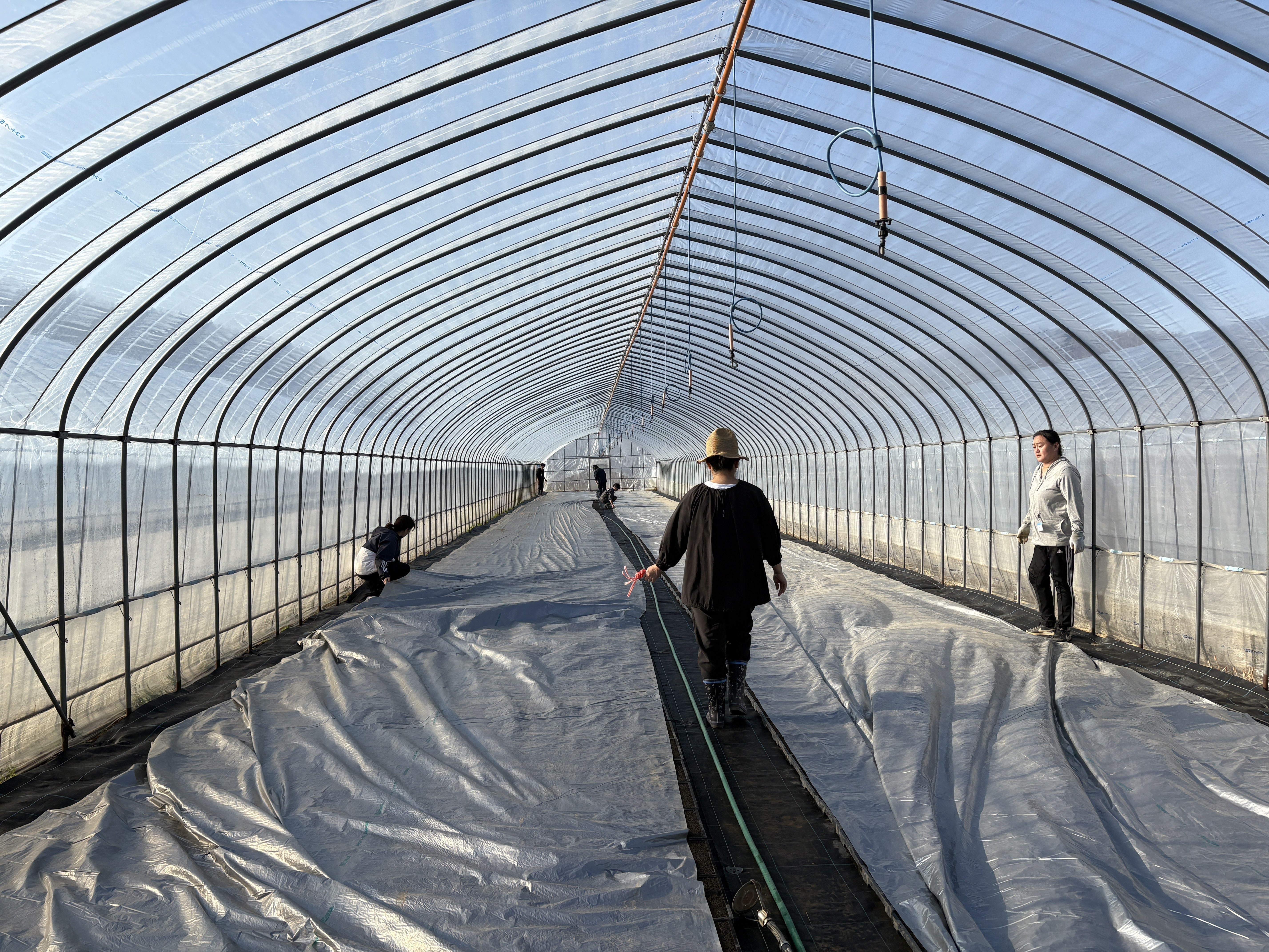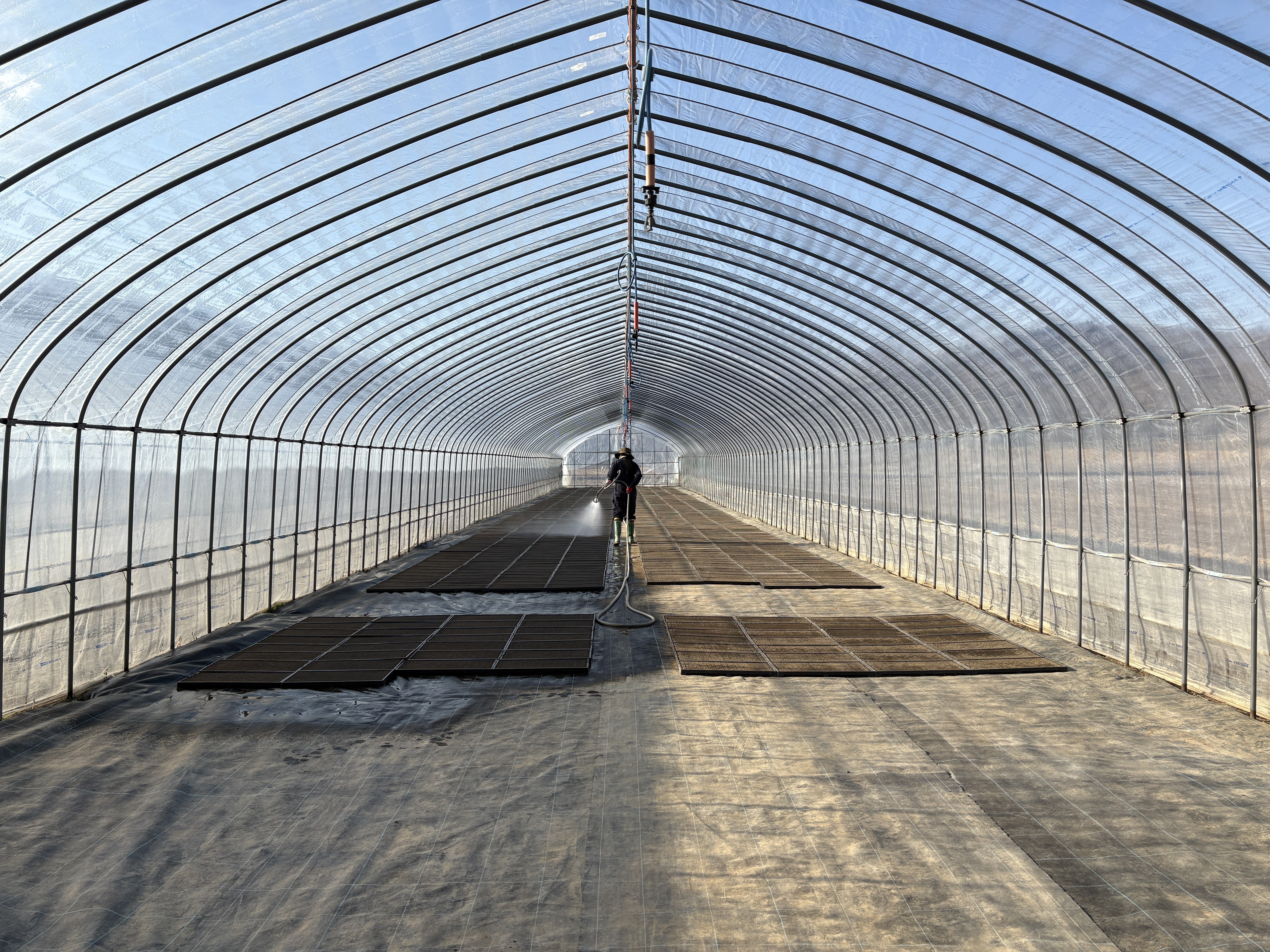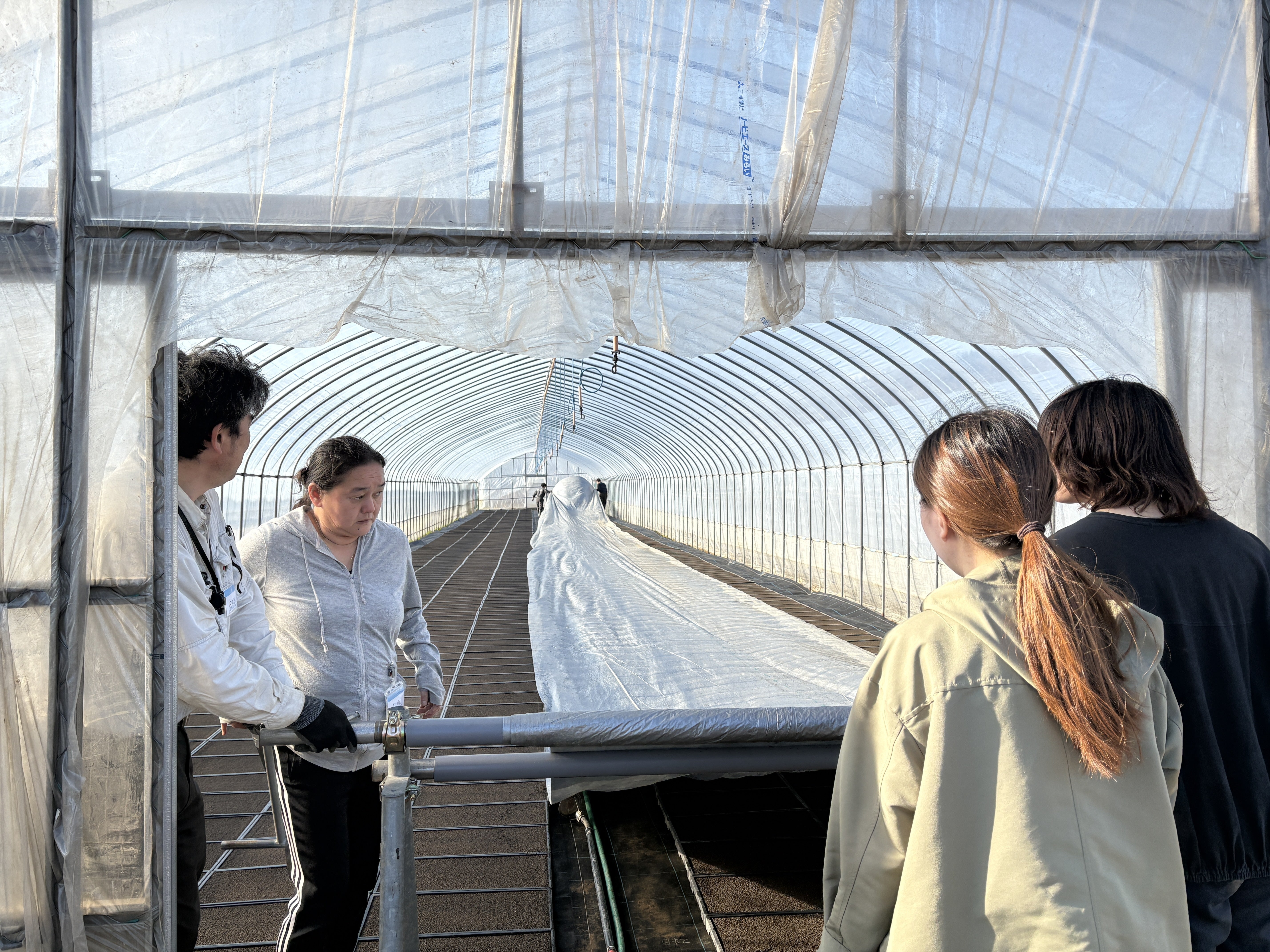 最後は、並べ終えたパレットにお薬をまき、ビニールシートを被せます。 ここで登場したのが、佐々木さんお手製のパイプを繋ぎ合わせたシート巻き取り機。農家さんの知恵に感心しながら、1日の作業を締めくくりました。