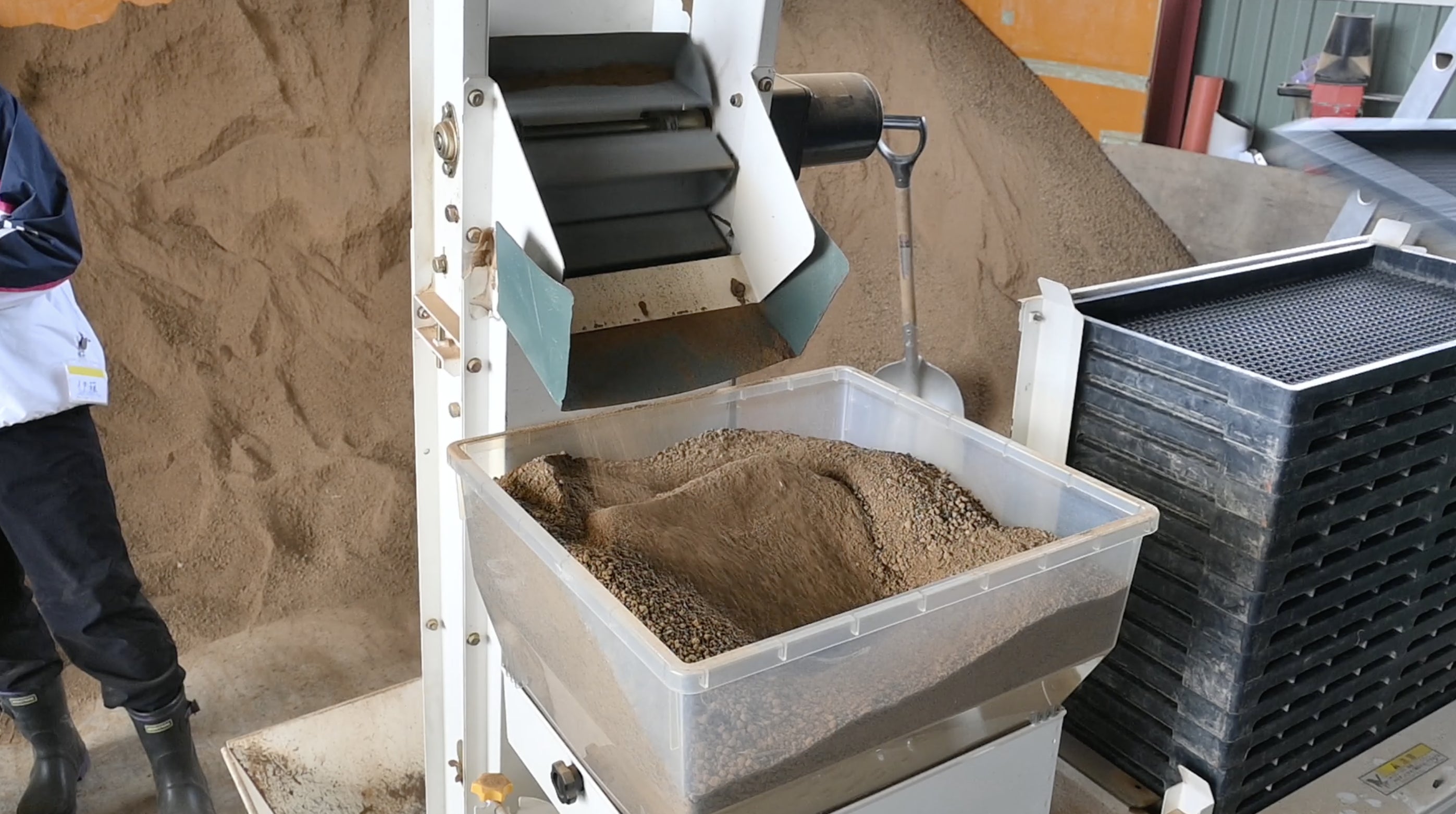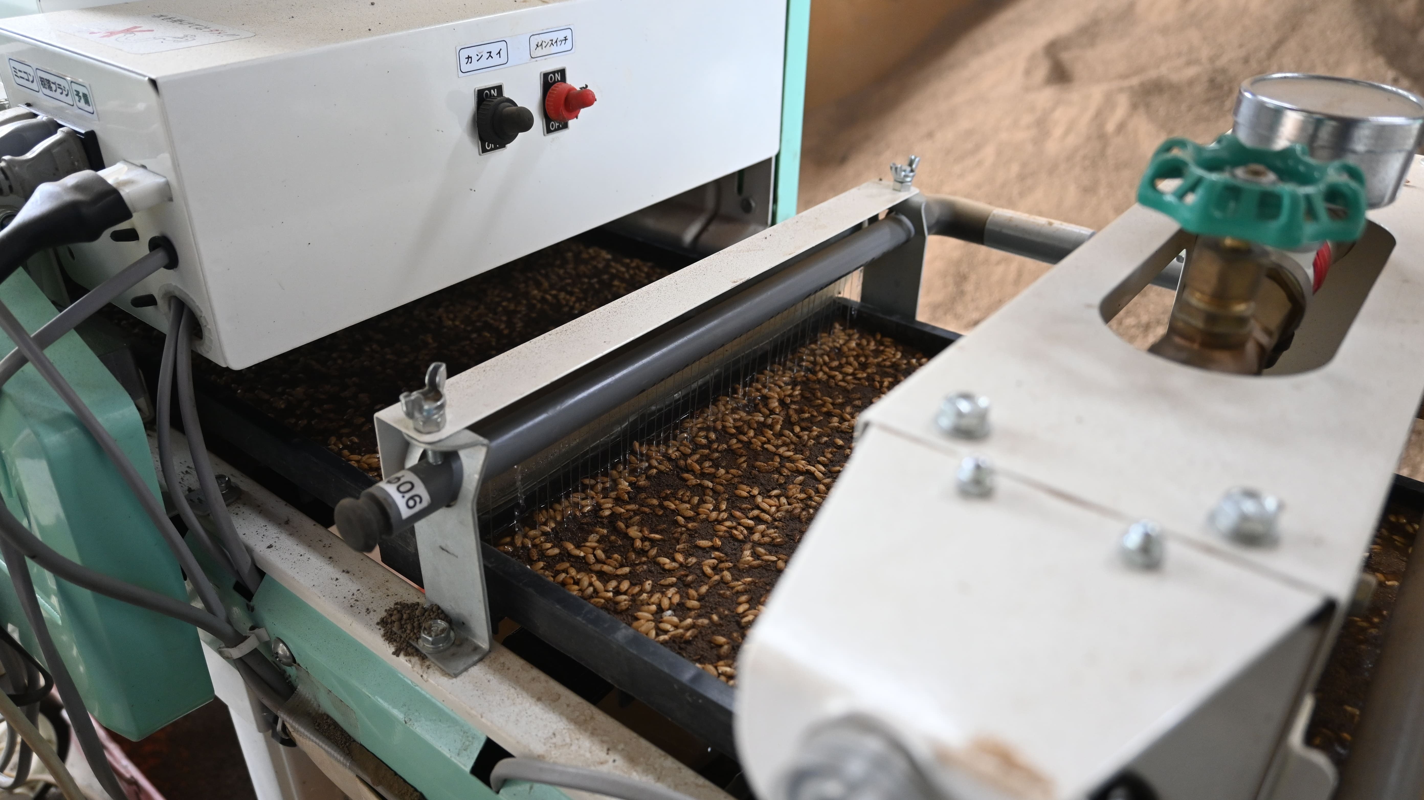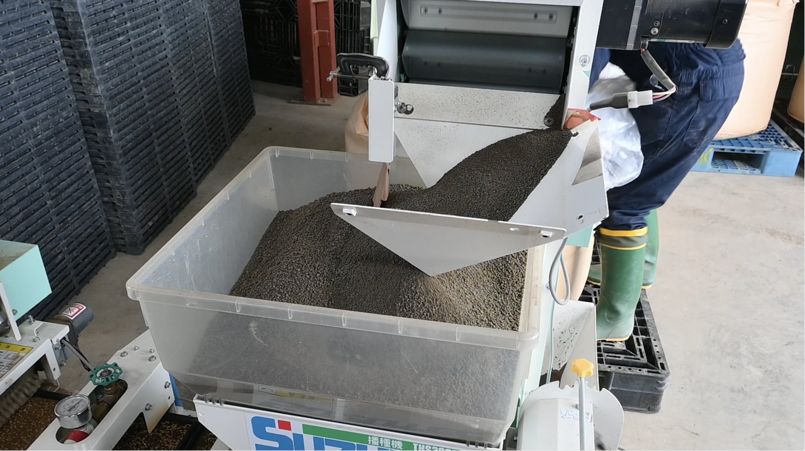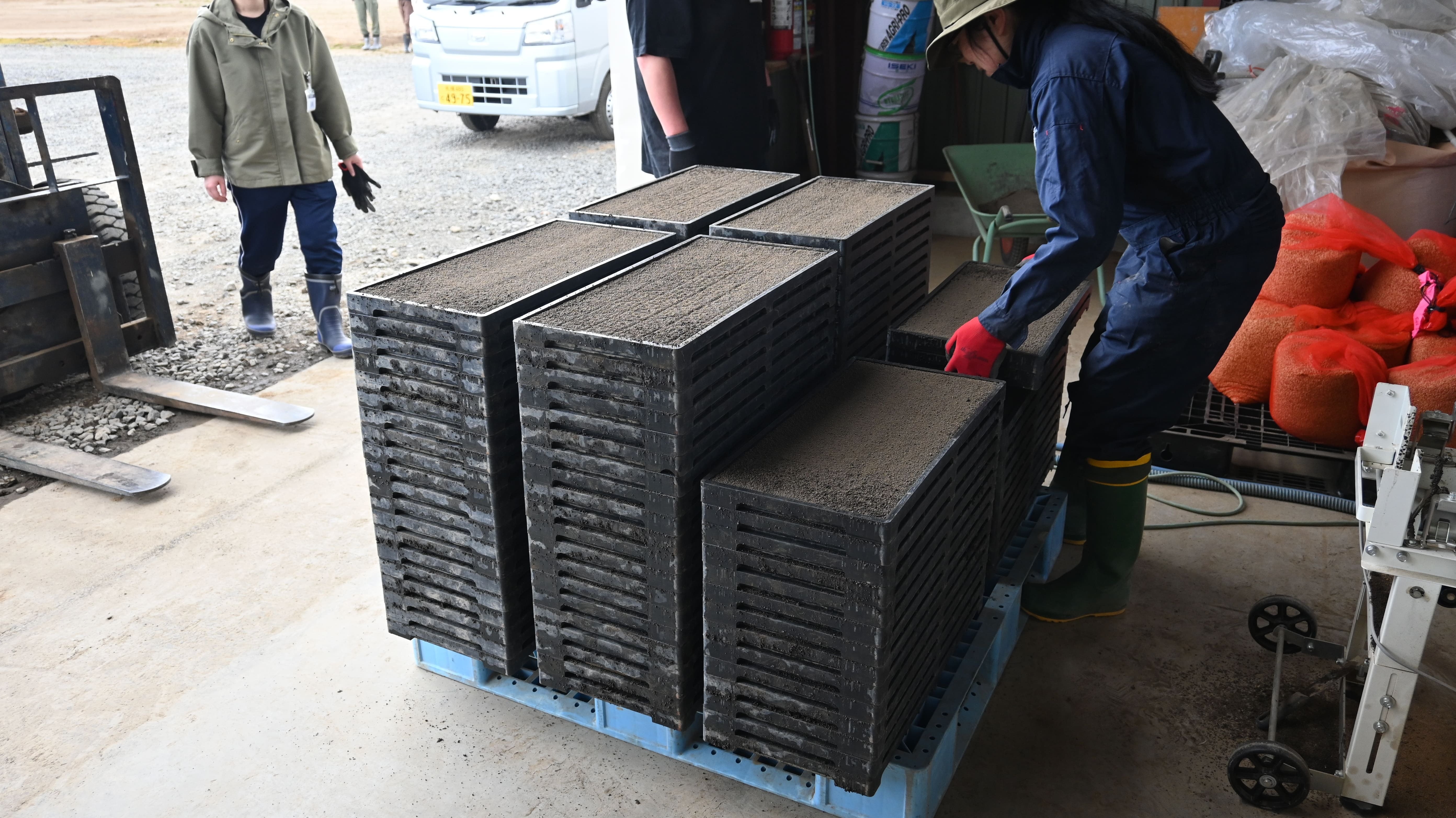 最初の作業は「播種機(はしゅき)」を使ったパレットづくり。 パレットに床土→種籾(たねもみ)→水→掛け土を順に詰めていくのですが、ここには佐々木さんの深いこだわりが詰まっていました。