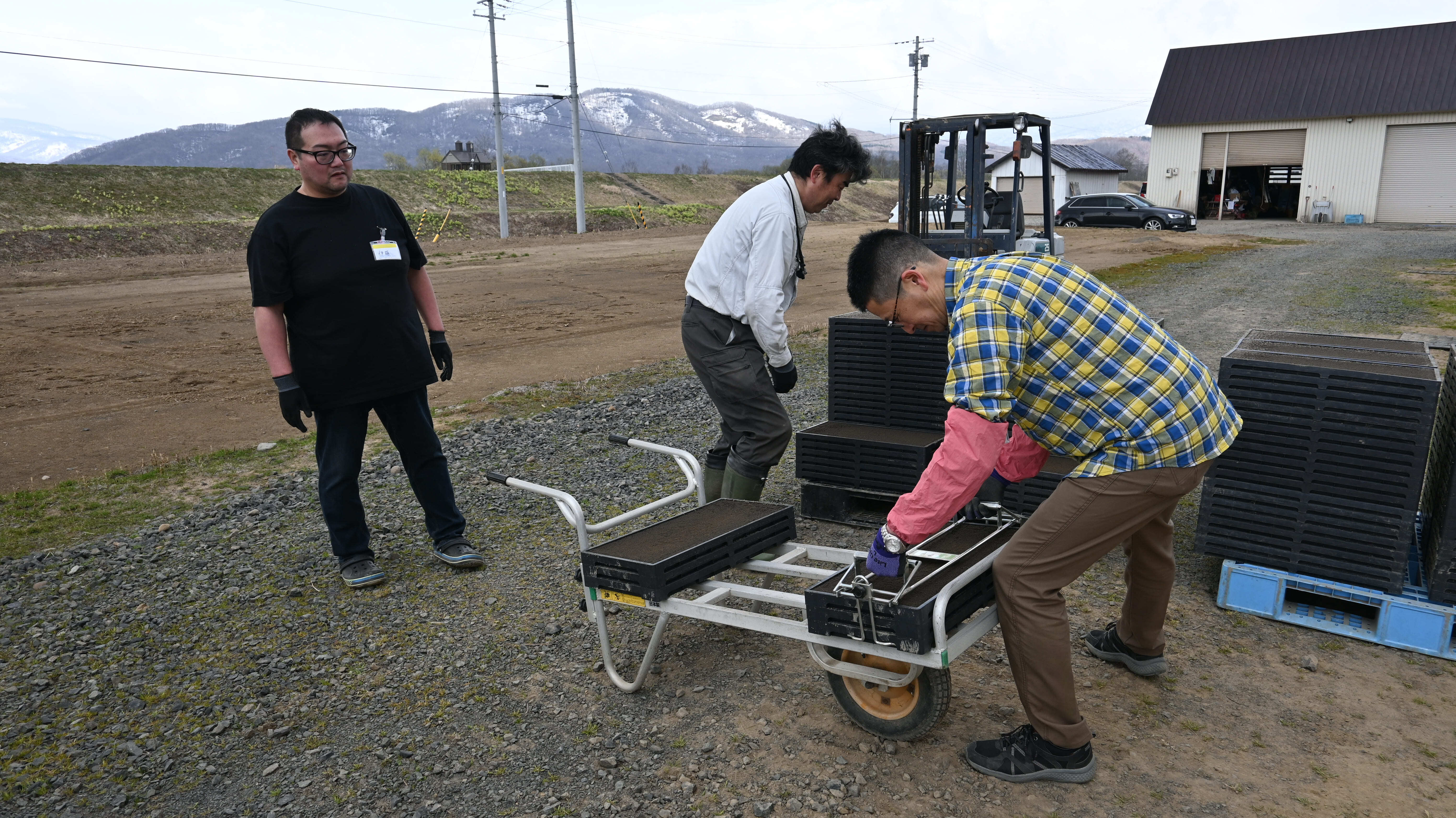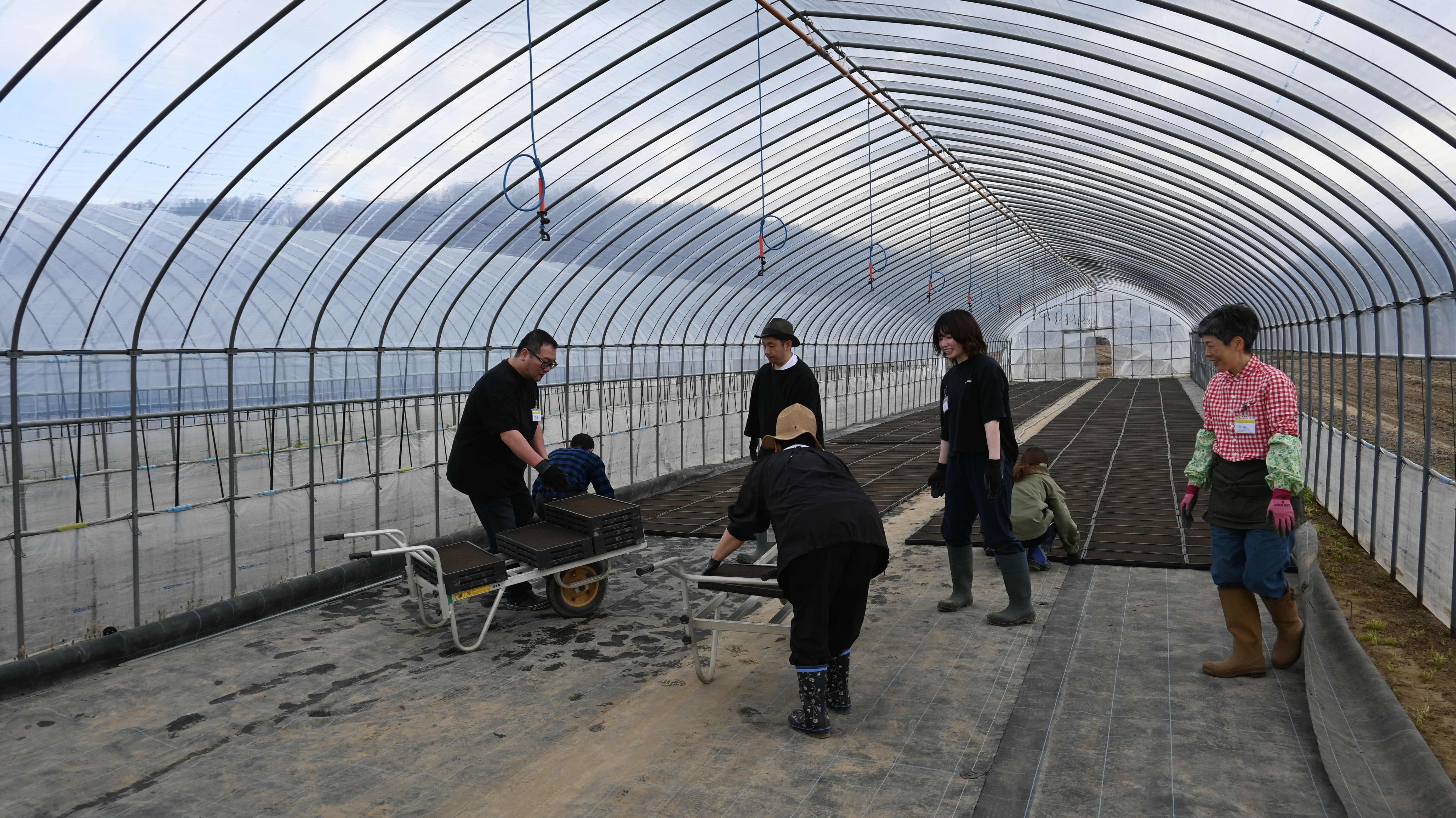 佐々木さんがトラクターでパレットを運び、私たちは「ねこ(一輪車)」に乗せてハウス内へ慎重に運びます。