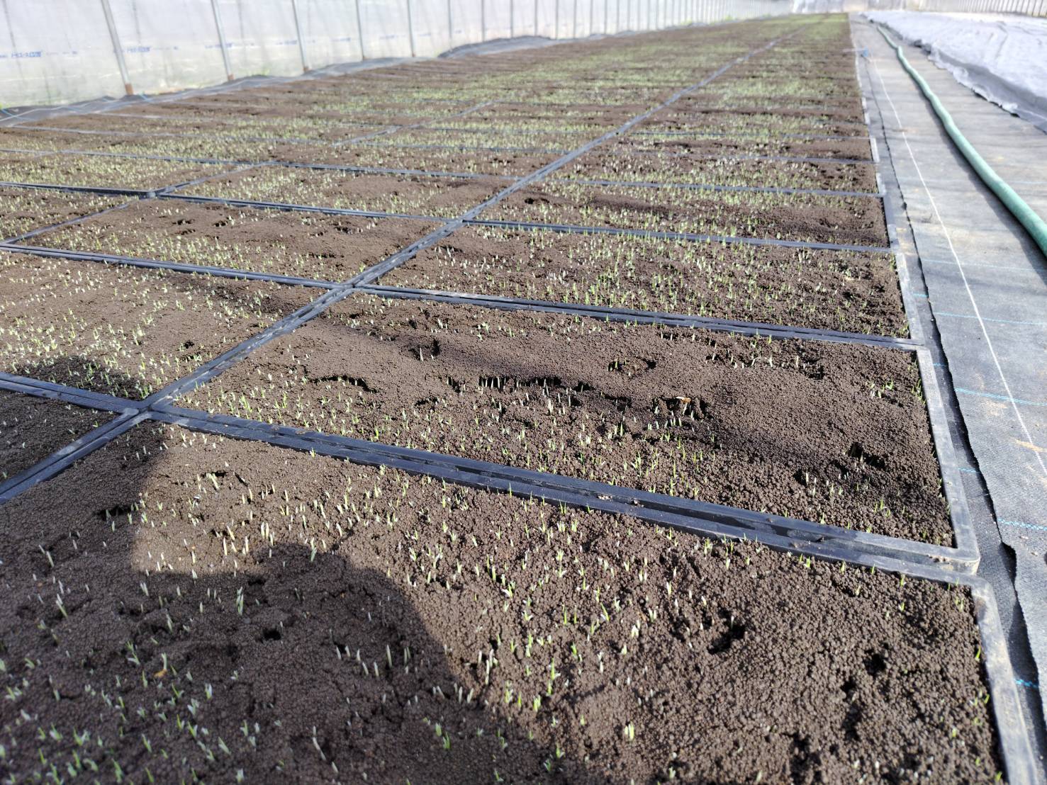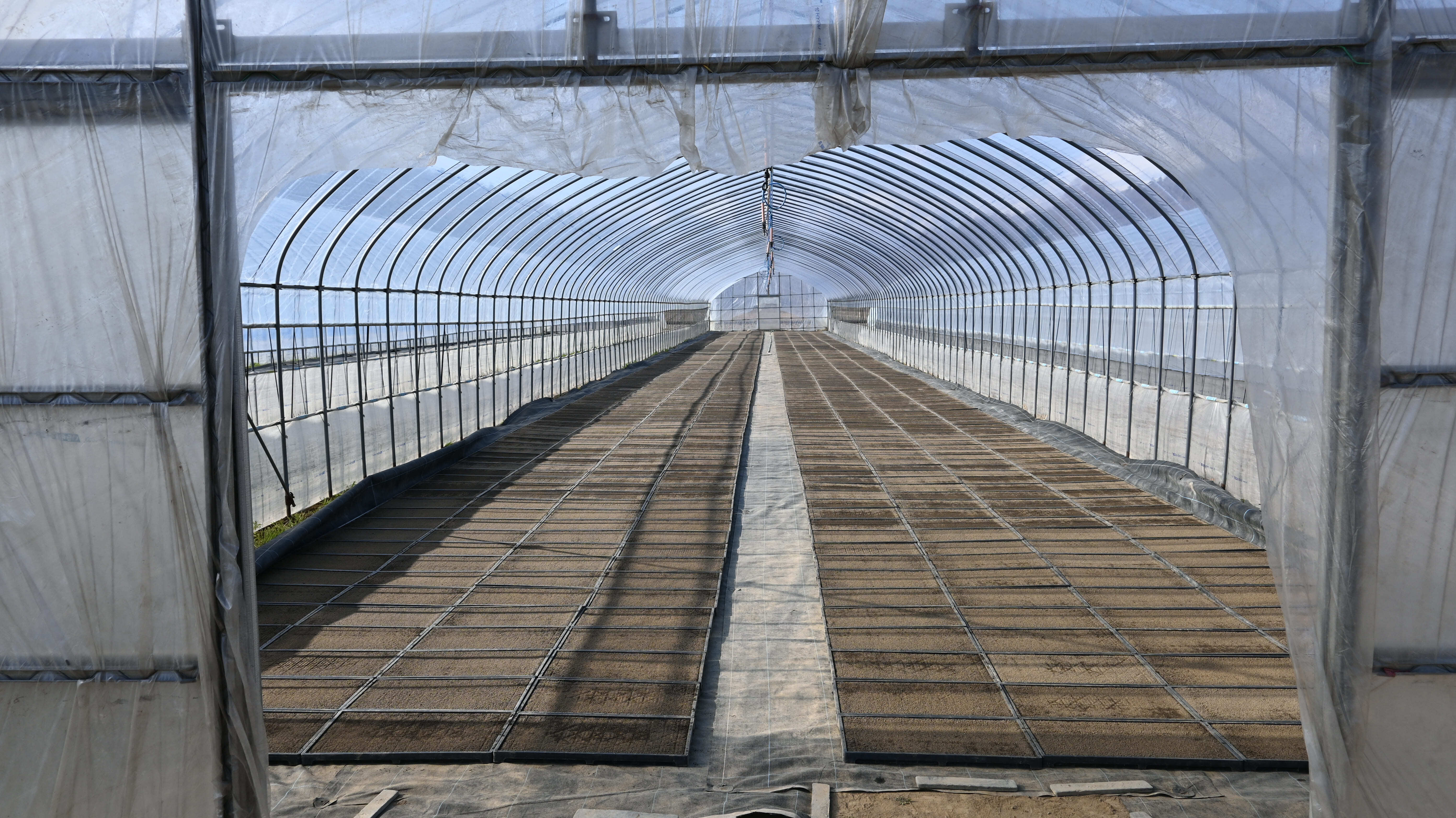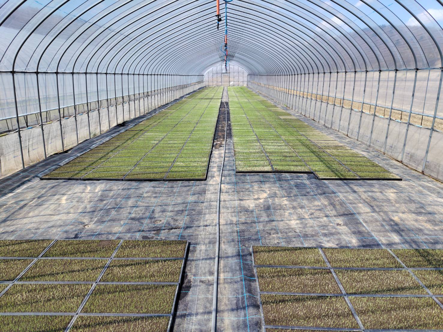 ハウスの中では、並べる担当の皆さんが「次はまだか」と期待の目で待ち構えています。その視線を感じながら、運ぶ手にも力が入ります。 バランスを崩して、大事な種籾を台無しにするわけにはいきません。まさに一歩一歩が真剣勝負です!
