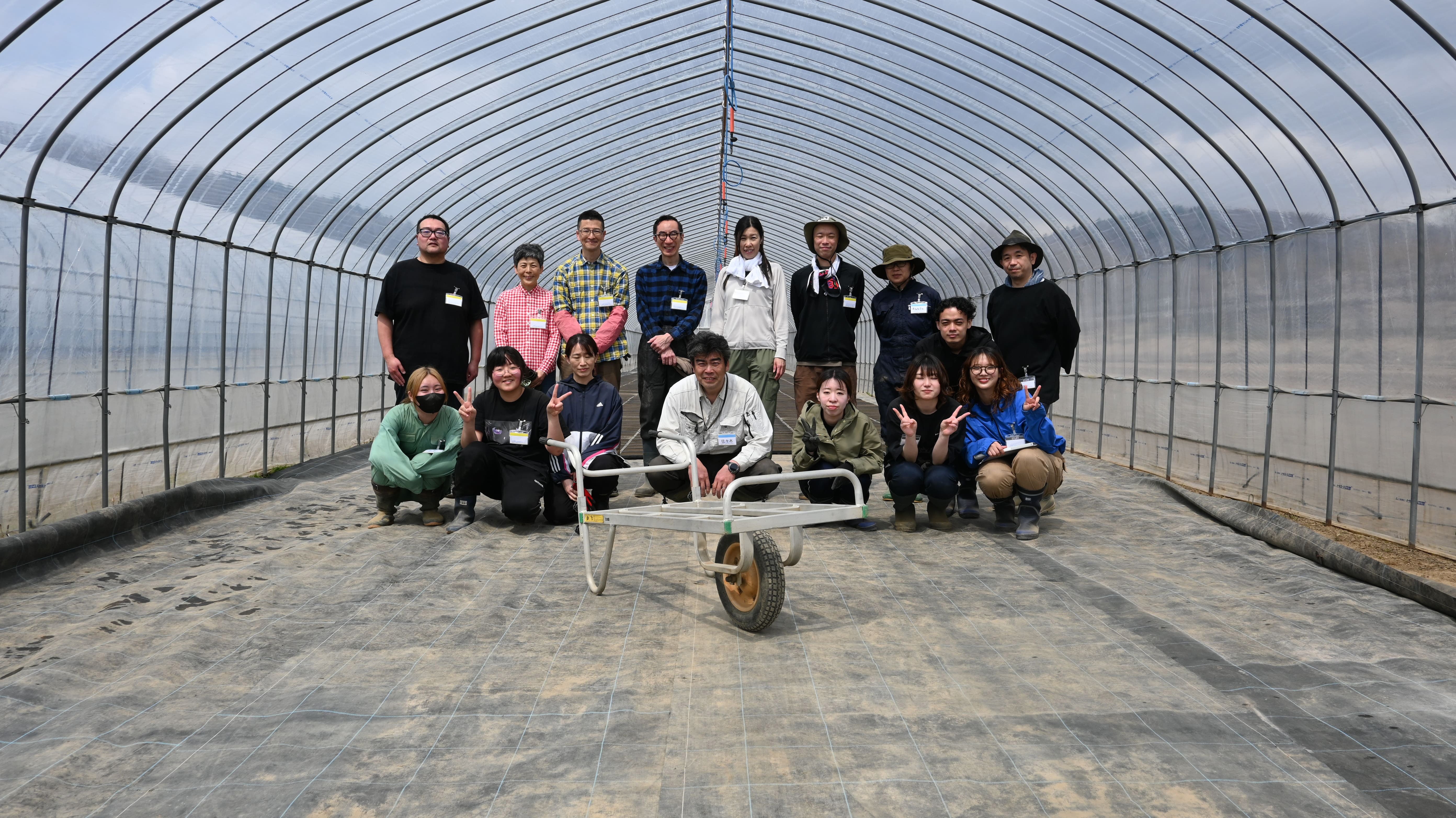 午後もハウスへの搬入を交代で進めながら、合間には蘭越の自然を堪能。 畑に眠る「山わさび」を掘り起こしたり、斜面の「行者にんにく」を摘んだりと、お米づくり以外の蘭越の宝探しに夢中になる一幕も。一見何か分からない草。山わさびはここに眠っています。すべてのパレットを敷き終えた瞬間、ハウス2本分にぎっしりと並んだ姿はまさに圧巻でした。 作業を終えたみんなでその景色を眺めると、思わずやりがいが込み上げます。