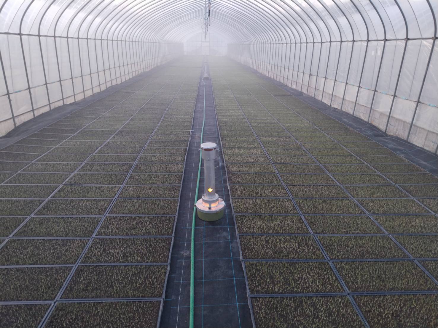 ハウスストーブで熱と空気を対流させて、霧に当たらないようにします。