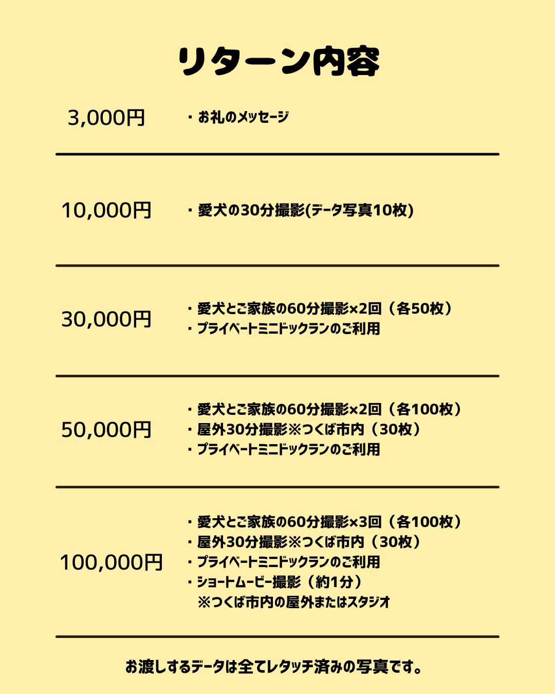 オープン後の通常プランよりもお得な内容となっておりますので、愛犬との撮影をご検討中の方は、ぜひこの機会にご支援いただけたら嬉しいです。