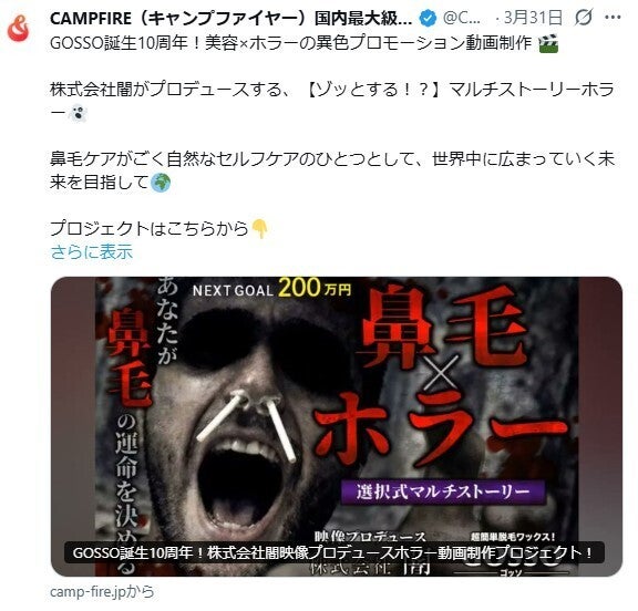 2026/04/02 11:13CAMPFIRE公式Xにご紹介いただきました。ありがとうございます!美容とホラーのコラボレーションとして、鼻毛ケアを身近に感じてもらえるよう楽しいコンテンツを目指します。まだまだクオリティアップをしていくので応援よろしくお願いします!CAMPFIRE公式Xのポストはこちらからhttps://x.com/CAMPFIREjp/status/2038926779843494244?s=20 もっと見る