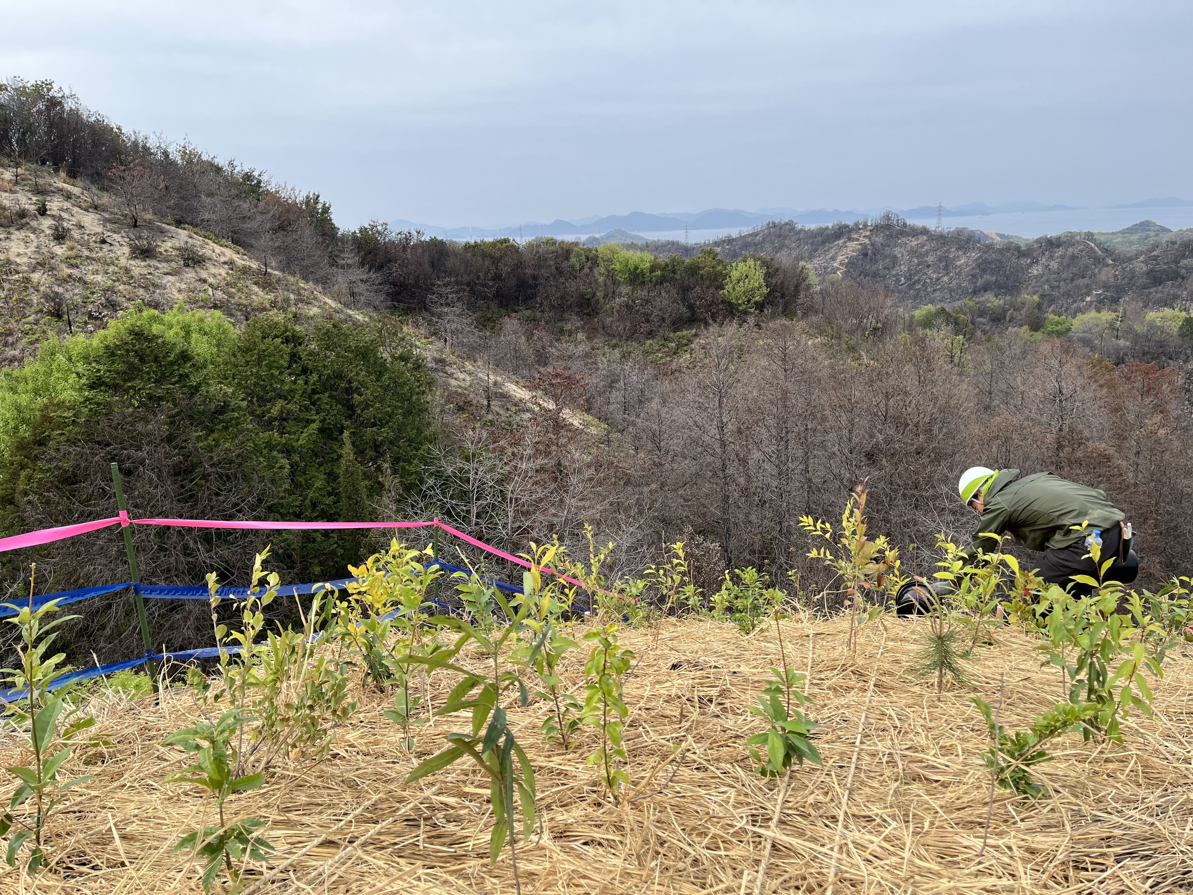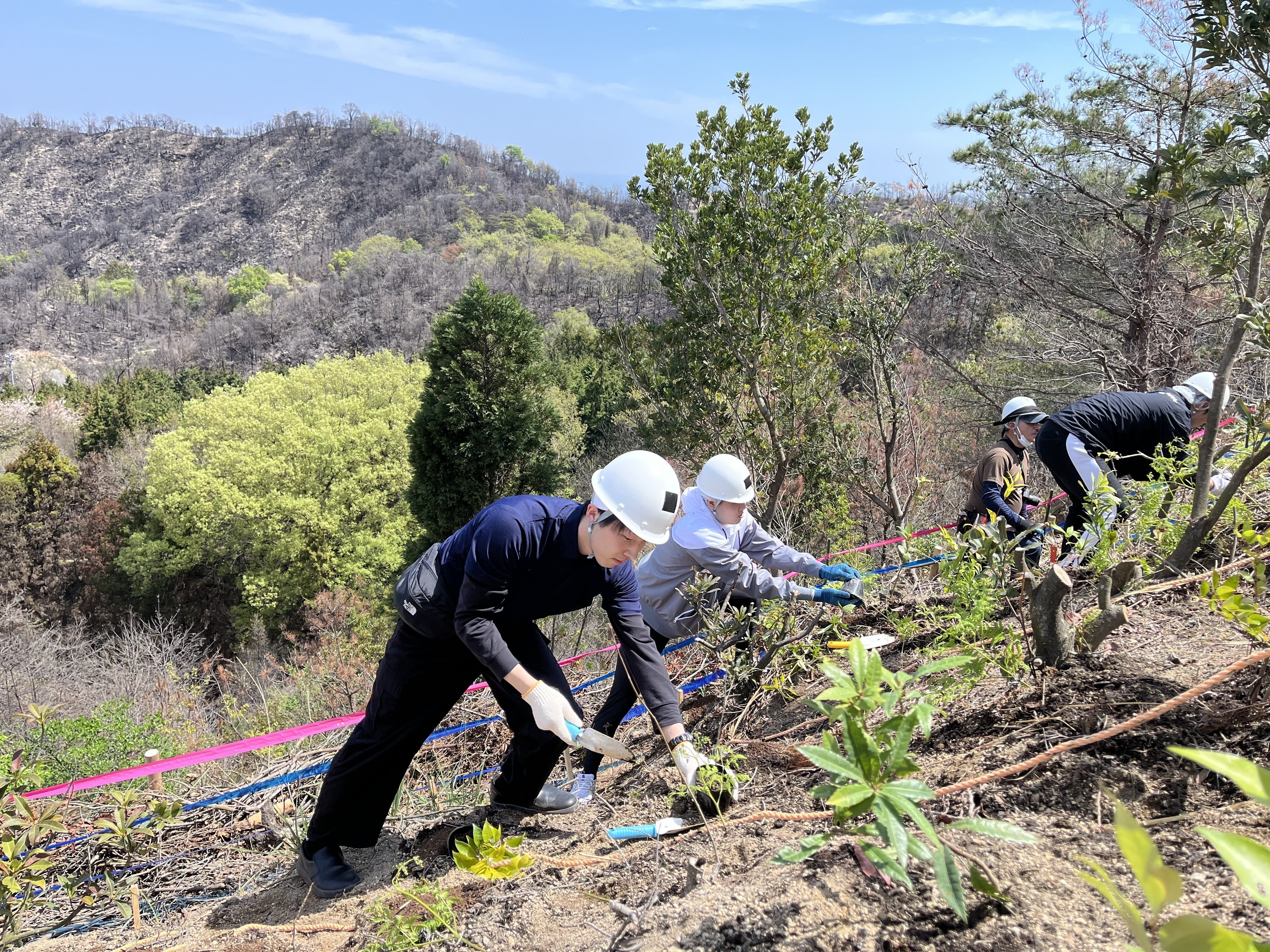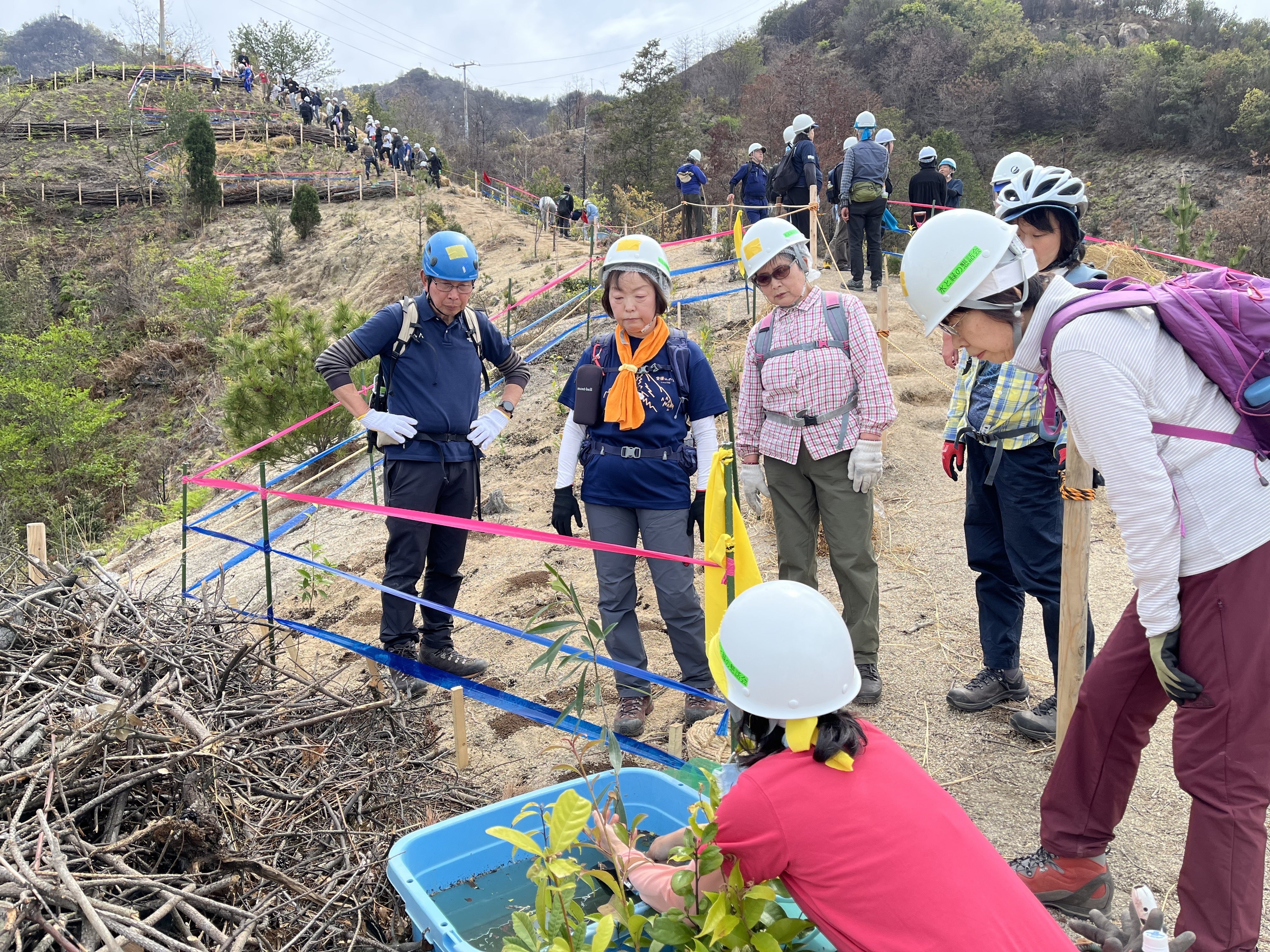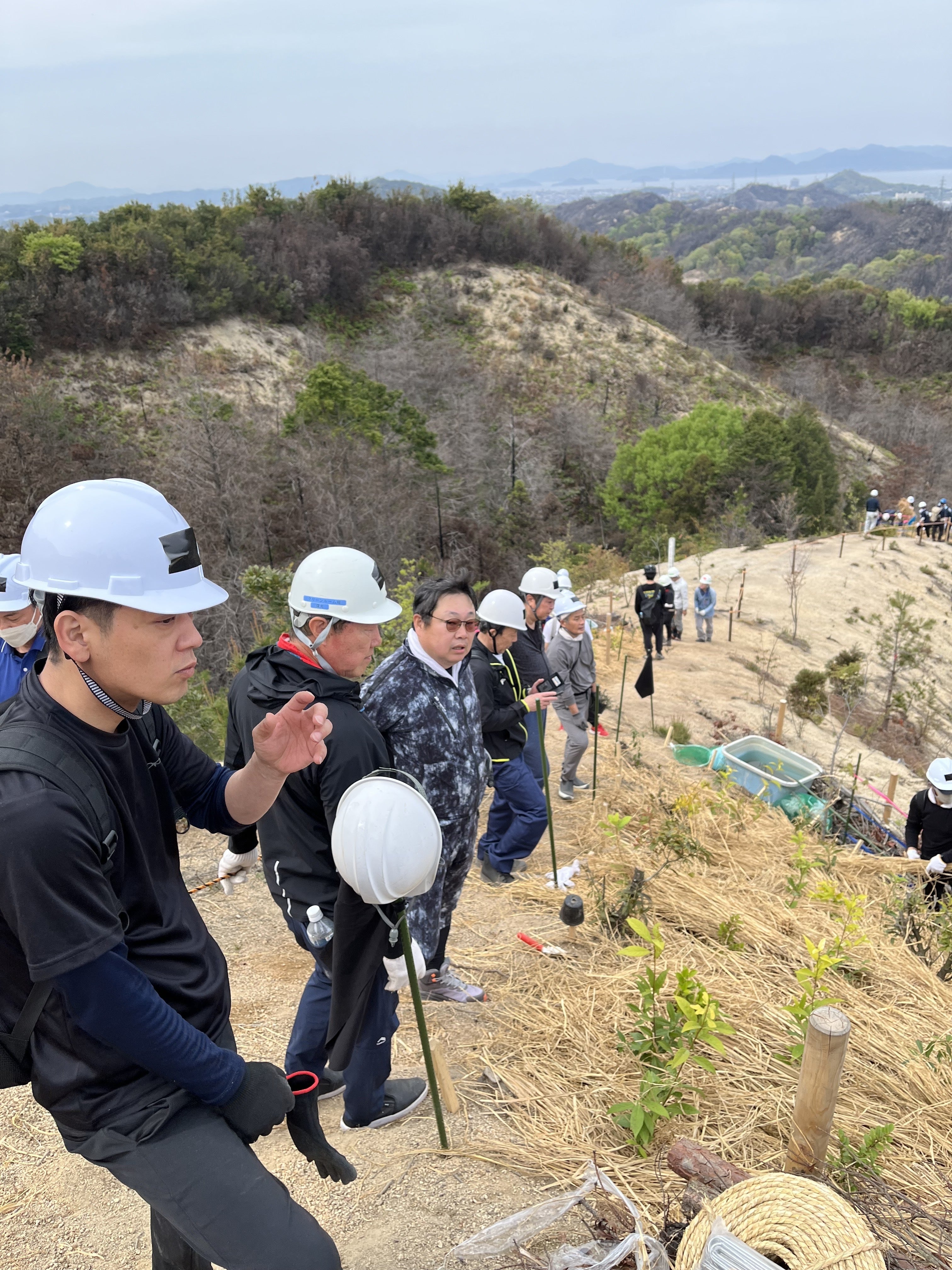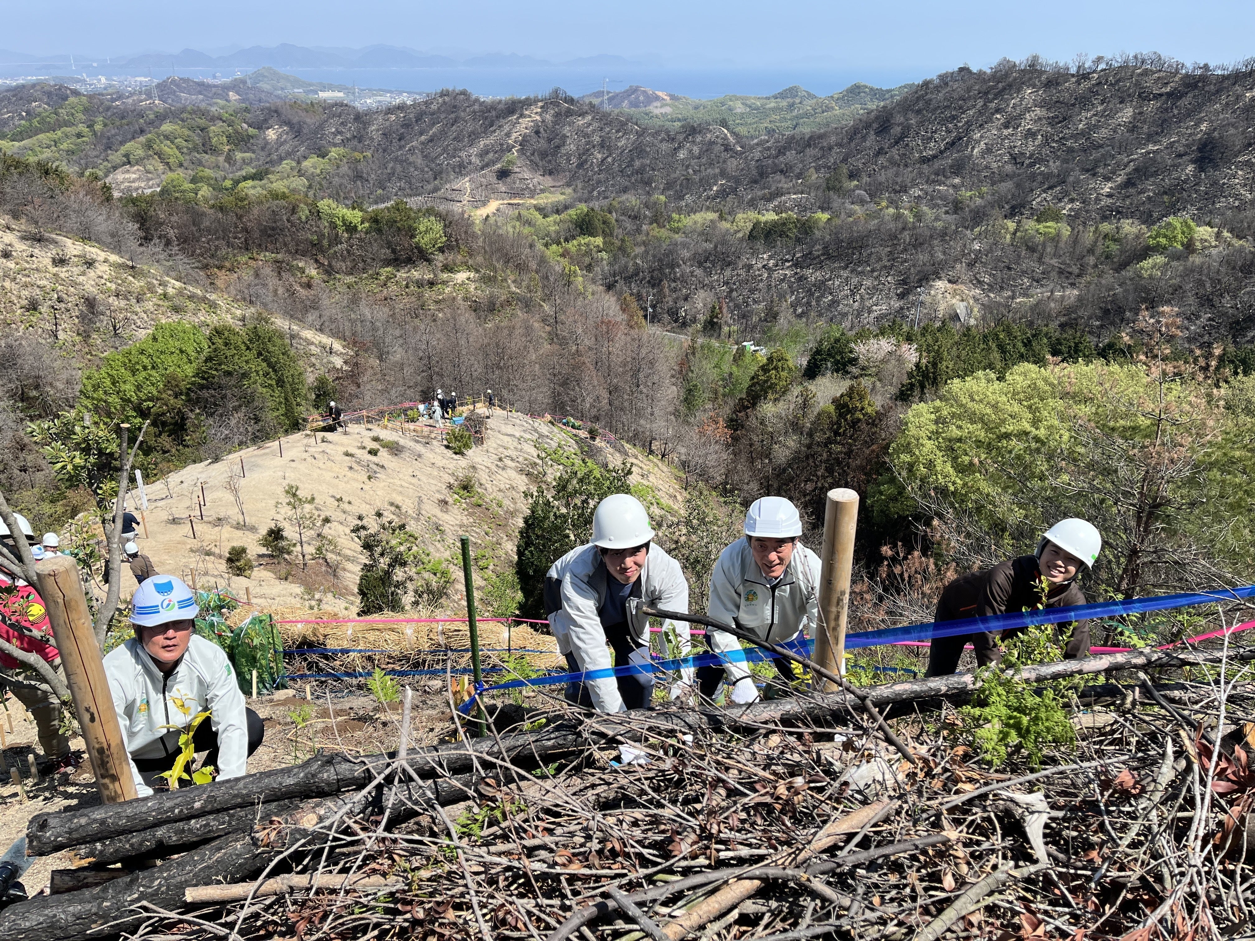 昨日(4月12日)、愛媛県今治市・笠松山における植樹祭を、無事に終えることができました。急斜面という厳しい環境ではありましたが、けが人もなく、すべての工程を安全に終えられたことをご報告いたします。