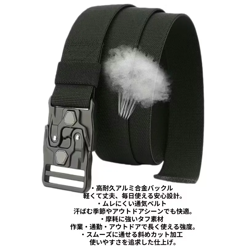 耐久性の高いアルミ合金バックルを採用し、日常からアウトドアまで幅広く使えるタフなベルトです。